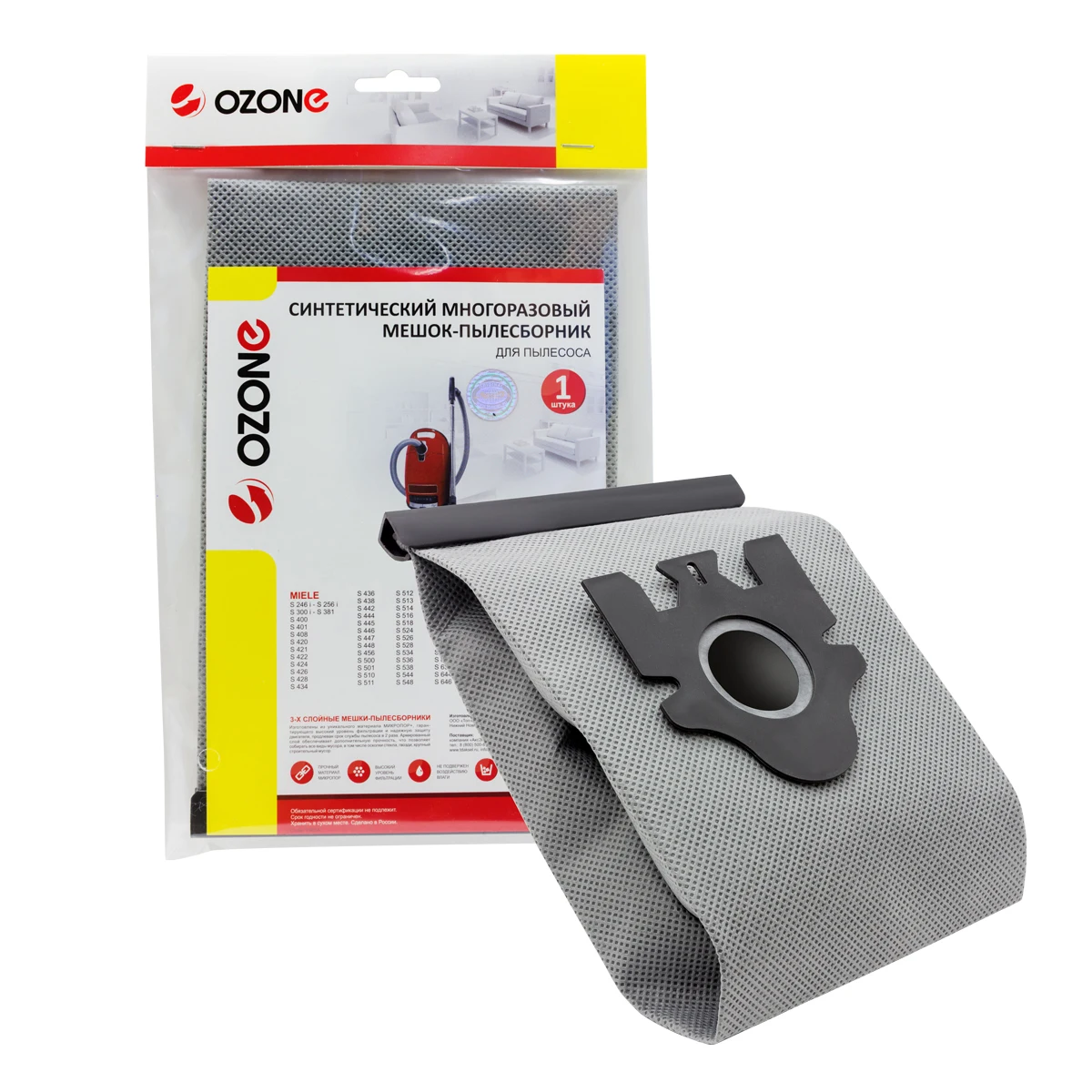 Reusable ozone dust bags are designed for installation in household vacuum cleaners. Dust collectors are made of multi-layer synthetic material micropore +, which is characterized by a high level of filtration and has anti-allergic properties. The reinforced layer guarantees increased strength, which allows you to collect all kinds of debris, including glass fragments and nails. Dust collectors provide reliable protection of the engine, extending the life of the vacuum cleaner twice. At the same time, the suction capacity is preserved even at maximum filling of the bag. In packaging-1 disposable dust cleaners. Tu 13.92.29-001-14331545-2018. Shelf life is not limited. Store in a dry place. Made in Russia.