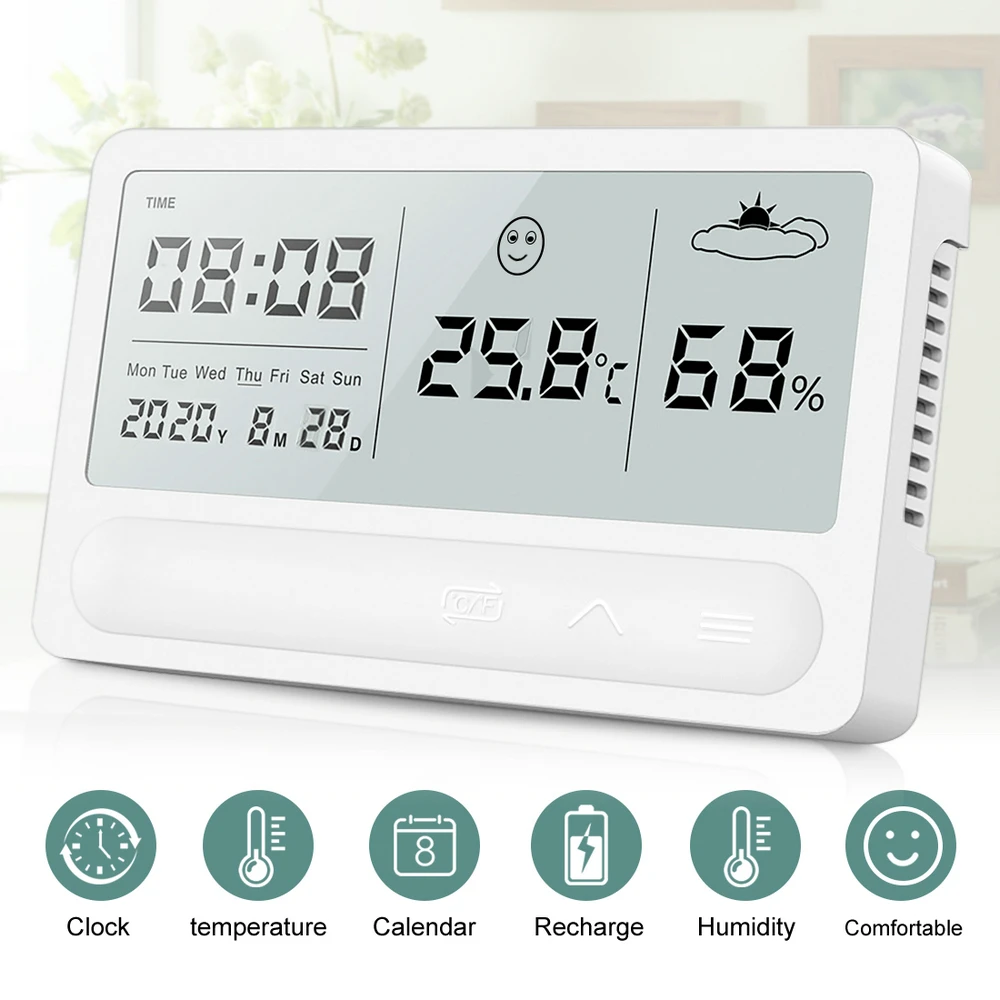 Простота в использовании-гигрометр также имеет функцию будильника. Просто нажмите три кнопки, вы можете легко установить время и дату, не вызывая путаницы. На задней части термометра имеется Скрытая подвесная скоба с отверстием, которая используется для настольного кронштейна и настенной установки. Вы можете использовать термометр в любом месте. Лучшее соотношение-оснащен широкоформатным дисплеем 16: 9, ЖК-дисплей может четко отображать количество, даже на очень больших расстояниях, можно четко читать температуру, влажность, время и дату. В то же время, отверстия с обеих сторон увеличены, чтобы более точно запечатлеть окружающую среду. Быстрые и точные показания-измерение данных обновляется каждые 2 секунды, чтобы обеспечить вам быстрые и точные значения. Измеряемый диапазон температур-10 °C ~ 65,0 °C (Точность: ± 1 °C) и диапазон влажности 10%-90% RH (Точность: ± 5%). Макс & Мин Записи-запись максимальной и минимальной температуры и влажности; Отображение комфорта при температуре и влажности, так что вы можете реагировать на основе числовых и комфортных наконечников, таких как регулировка увлажнителя или термостата, обеспечение правильного контроля температуры и влажности в помещении хорошо подходит для кожи, аллергенов и других видов здоровья. Перезаряжаемая технология-этот цифровой гигрометр в помещении использует технологию перезаряжаемой литиевой батареи и имеет свою собственную функцию регулирования напряжения. Он используется для 3-4 месяцев после каждой зарядки, экономя проблемы с заменой батареи.