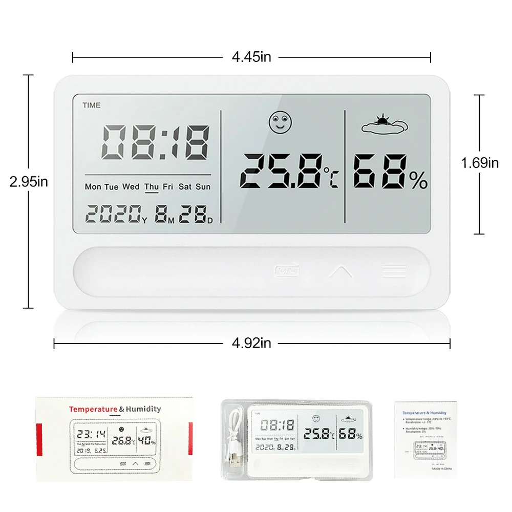 Чувствительный термо-датчик гигрометра Благодаря высокой точности цифровой мини-гигро-термометр станет оптимальным выбором как для вашей жизни, так и для работы. Спецификация: Диапазон температур: -10 °C-65 °C (33 °F-140 °F) Диапазон влажности: 10%?90% RH Единица измерения температуры: °C / °F опционально Частота обновления: 2 секунды Точность: ± 1 °C/5% RH Размер изделия: 125*74*17 мм Вес нетто: 100 г Размер: 12,5x7,4x1,7 см Кнопка: нажмите на кнопку. Функциональный дисплей: Время и дата Цифровой будильник Мониторинг температуры и влажности в помещении Макс и Мин Записи температуры Макс и Мин Записи влажности Индикатор комфорта Удобный выразительный дисплей Переключение температуры (℃/℉) Посылка: 1 * термометр 1 * Руководство пользователя 1 * USB