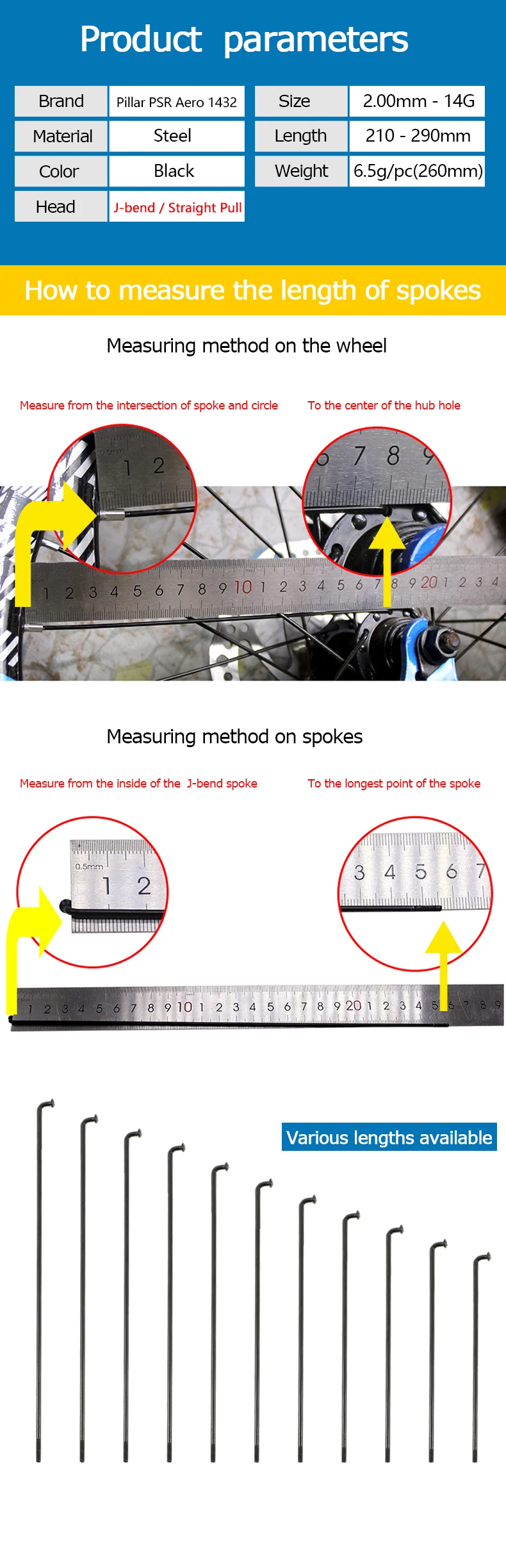 ★Столб PSR Aero 1432 спицы ● Головка: j-изгиб/Прямая тяга ● Цвет: черный ● Размер: 2,0 мм-14 г ● Длина: 210 - 290 мм ● Вес: 6,5 г/шт. (260 мм) ● Длина в готовом состоянии: J-изгиб или прямая тяга 215 мм j-образная 218 мм j-образная 221 мм резьба 243 мм резьба 246 мм резьба 249 мм резьба 253 мм резьба 257 мм резьба 259 мм резьба 264 мм резьба 268 мм резьба 271 штифты 278 мм штифты 282 мм штифты 290 мм ★Мы можем отрезать любую длину от 210 мм-221 мм, 236 мм-290 мм в соответствии с вашими потребностями, возможна Смешанная Длина заказа. ★Пожалуйста, дайте мне знать длину спиц, длину сосков и цвет сосков, которые вы хотите после оплаты.