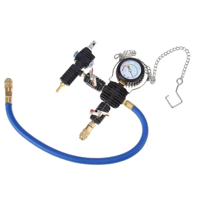 4. Запускайте испытательный насос до тех пор, пока давление не достигнет 10-15 фунтов на квадратный дюйм Примечание: Избегайте давления в 35 фунтов на квадратный дюйм или выше! Контрольный манометр. Если отображаемое значение уменьшается, утечка в системе охлаждения.