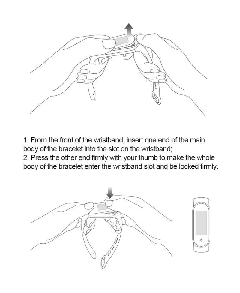 2. Плотно нажмите на другой конец большим пальцем, чтобы весь корпус браслета мог войти в слот для браслета и надежно зафиксироваться.