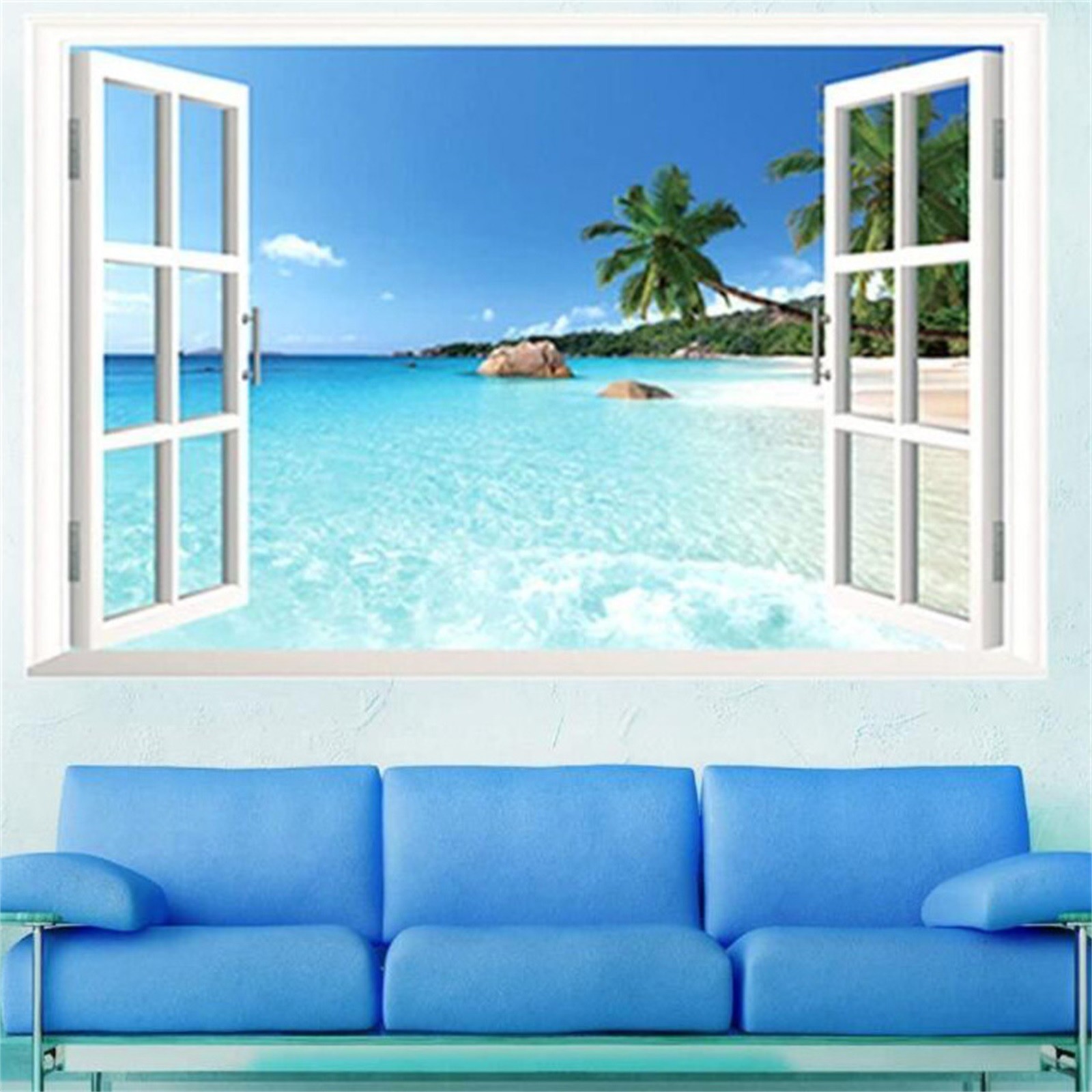 Большая 3D морская Наклейка на стену с окном, съемные ПВХ наклейки для дома, DIY постеры для гостиной, спальни, столовой