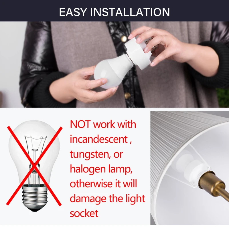 Совместимость: E26 E27 светодиодный, CFL, люминесцентные лампы и т. д., но не лампы накаливания, галогенные лампы или вольфрамовые лампы