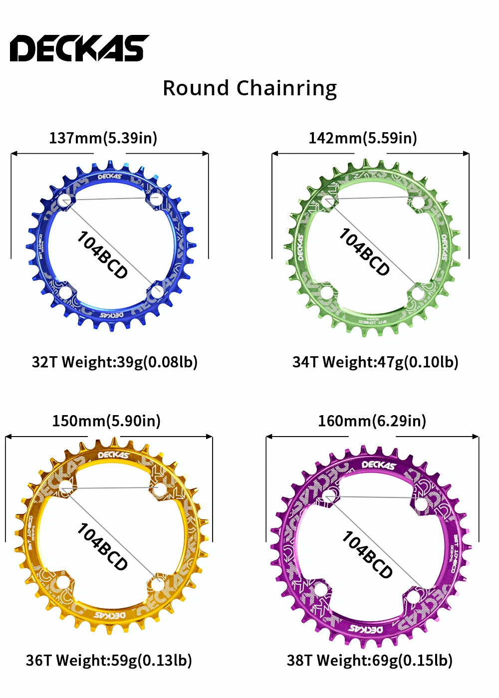 Вес: 32T(38g/0.08lb), 34T(47g/0.1lb), 36T(59g/0.13lb), 38T(69g/0.15lb)