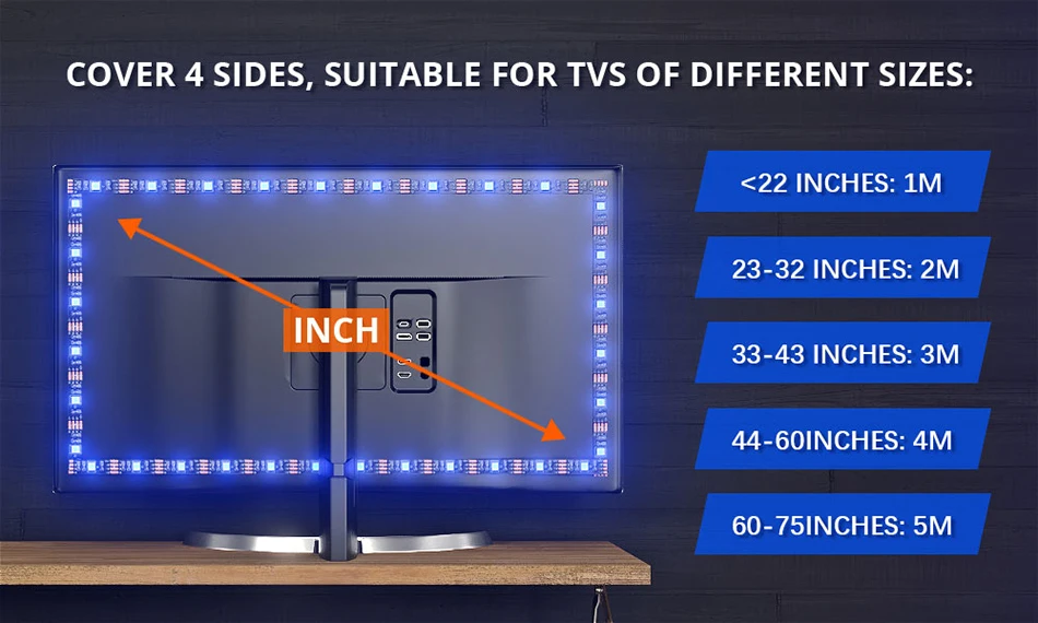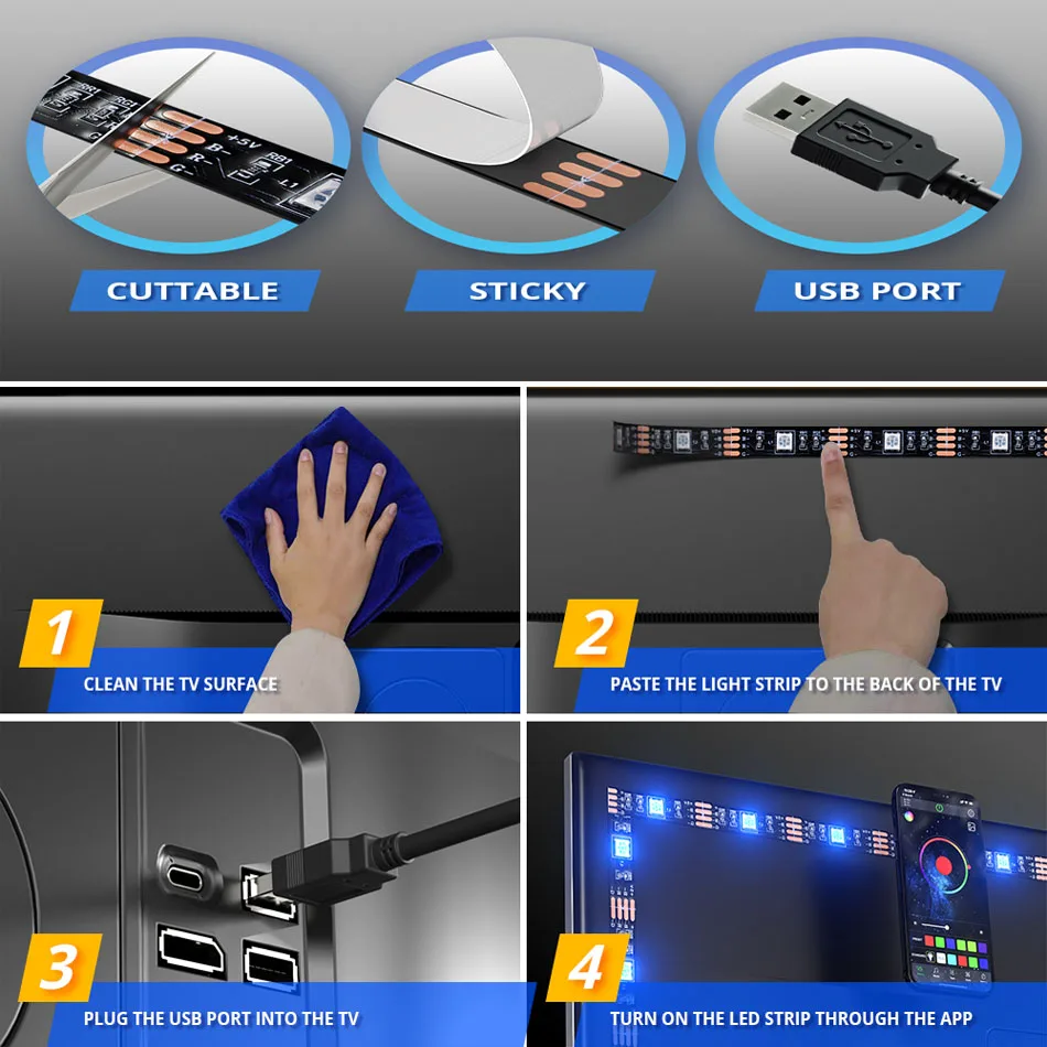 Светильник с питанием от USB может быть легко установлен за телевизором. Уникальные крепкие поролоновые клеи и зажимы для пряжки гарантируют лучшую фиксацию светодиодной ленты на вашем телевизоре.