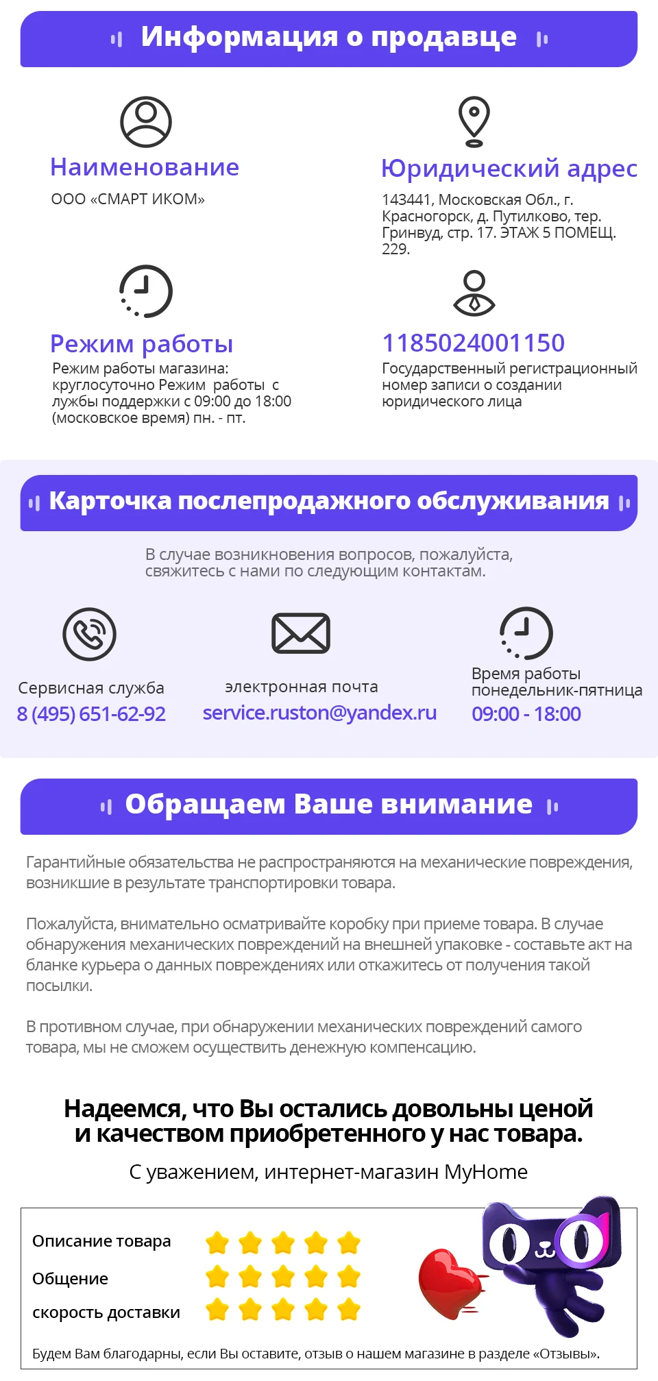 Магазина MyHome Russia Store работает с 24.06.2021. его рейтинг составлет 95.21 баллов из 100. В избранное добавили 51125 покупателя. Средний рейтинг торваров продавца 4.8 в продаже представленно 194 наименований товаров, успешно доставлено 40637 заказов. 11571 покупателей оставили отзывы о продавце.