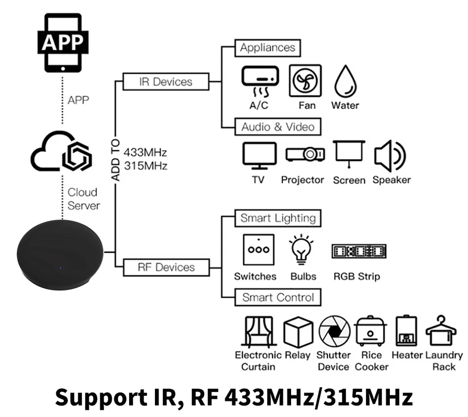 Вы можете дистанционно управлять этими устройствами с помощью нажатия пальца на мобильном приложении, также вы управляете устройствами RF-enabeld, такими как занавески, роллер затвор, двери гаража, RF переключатель и т. Д.