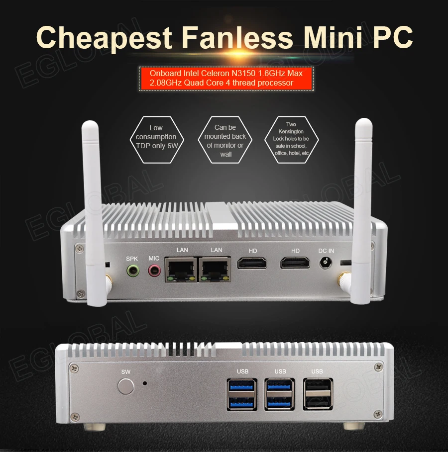 Информация о мини-ПК EGLOBAL Параметры процессора только для справки Бортовой процессор Intel Celeron N3150 1,6 ГГц Max 2,08 ГГц двухъядерный 4 нити Мини-ПК Barebone («без Ram без хранения») посылка не включает Wi-Fi (антенны), если вам нужно, пожалуйста, оплатите дополнительно $7Эта ссылка. Изюминка продукта -Корпус из алюминиевого сплава серебристого цвета, изысканное производство снаружи Дизайн с высоким качеством, тонкий дизайн 173*127*39 мм. -Безвентиляторная система без вентилятора охлаждения, без шума, работает до 24 часов. -Низкое потребление TDP всего 6 Вт, экономит много энергии и экологичность. -Может стоять бесплатно кронштейн или может быть установлен на задней панели монитора или стены. -Синхронно поддерживает выход 2 HDMI. -Два отверстия для замка Kensington позволяют устройству более безопасно в школе, офисе, гостинице и т. д. Спецификация
