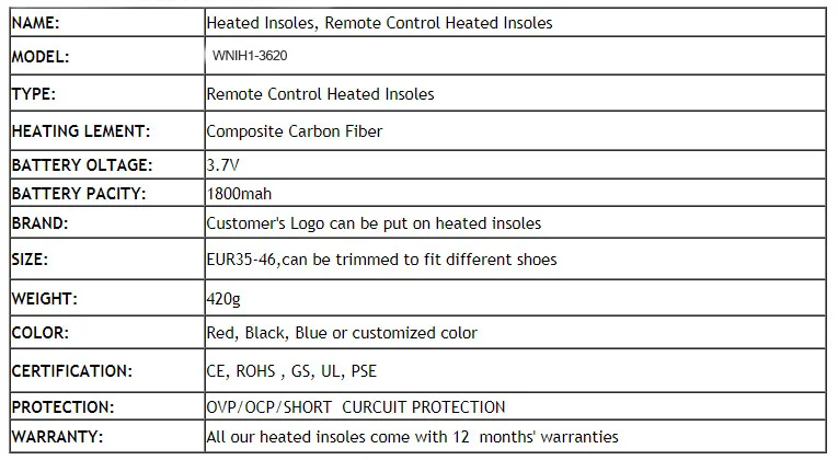 CE, RoHS, GS, UL, PSE одобрены, все наши нагревательные стельки поставляются с 12 месячными гарантиями.
