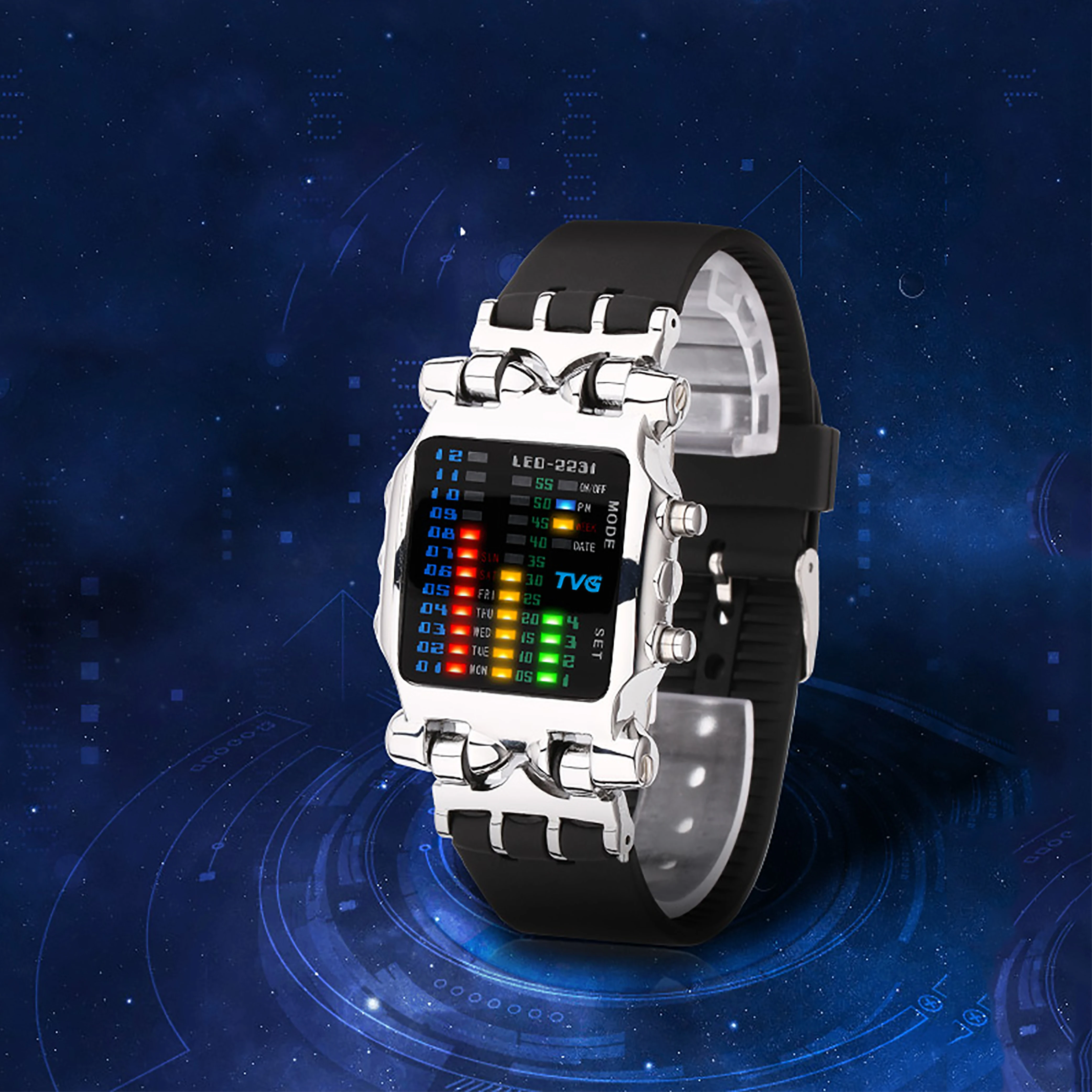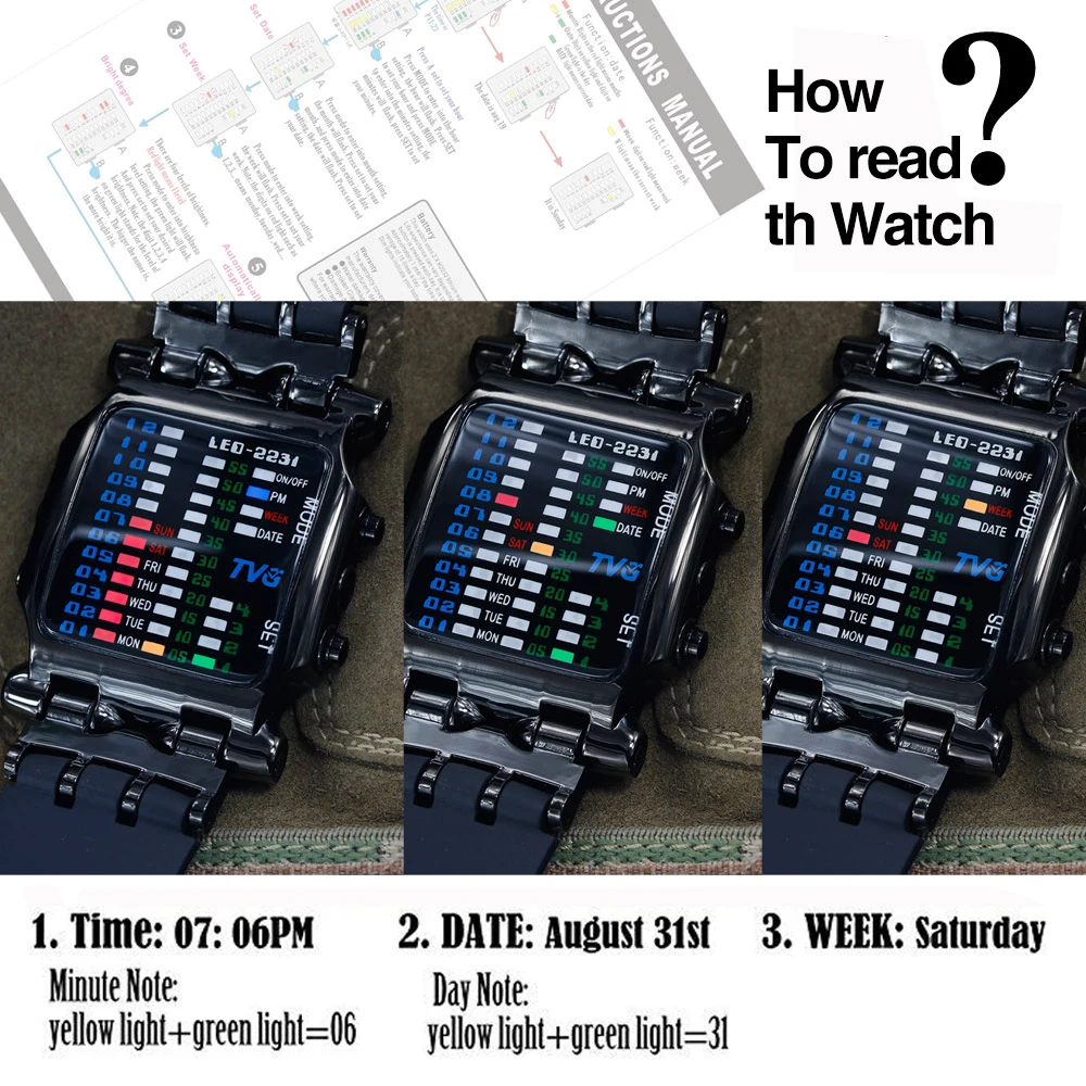 Модель: KM-2231Стиль: спортивный, Повседневный, модныйДисплей: ЦифровойМеханизм: Оригинальный часовой механизм + импортные аккумуляторы Особенности:-Наручные часы TVG(482) с 2 вариантами;-Оригинальный цифровой ЖК-дисплей;-Часы, минуты, секунды, дата, фосфоресцирующий;-Высокостойкое к истиранию стекло;-Высококачественный силиконовый ремешок;-2 года долгий срок службы батареи-Погрешность при ходьбе ± 45/м-Гарантия качества от производителя на 12 месяцев-Водонепроницаемость 30 метров (пожалуйста, не нажимайте кнопки под водой) Характеристики продукта:Чехол Толщина: 1,3 см (0,51 дюймов)Чехол Ширина: 4,3 см (1,69 дюймов)Ширина ремешка: 2,2 см (0,86 дюймов)Длина ремешка: 26,3 см (10,35 дюйма)Регулируемый ремешок: Да Компоненты в комплекте:-Часы TVG-1 шт.-1 x Подарочная коробка-Руководство пользователя (на английском языке)-1 шт.-1 гарантийный талонСмотрите так же другие товары: