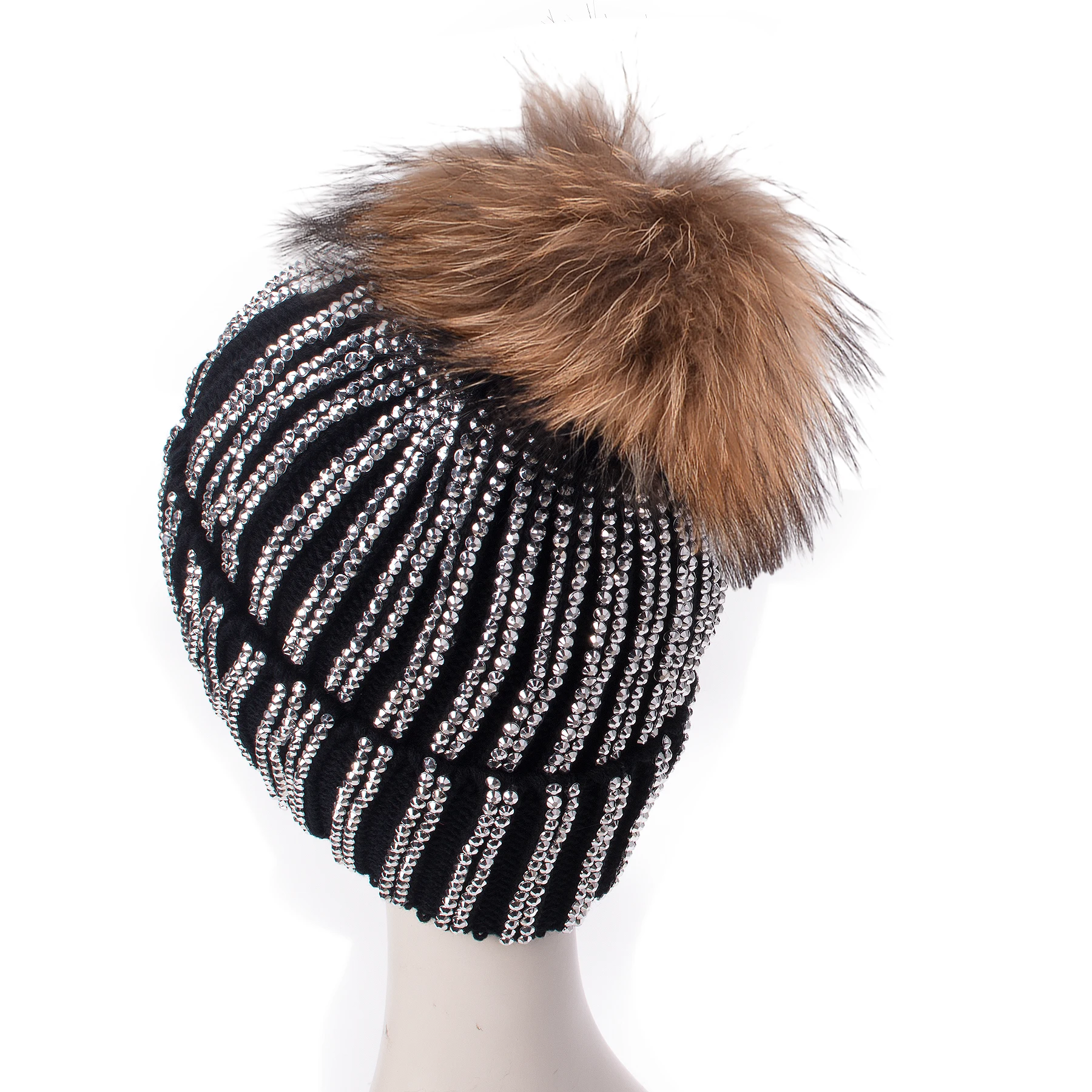 Новая женская шапка, Осень-зима, шапки, натуральный мех, помпон, женская шапка, 2000 шт, стразы, вязаная теплая шапка, женская Лыжная Шапка кэжуал