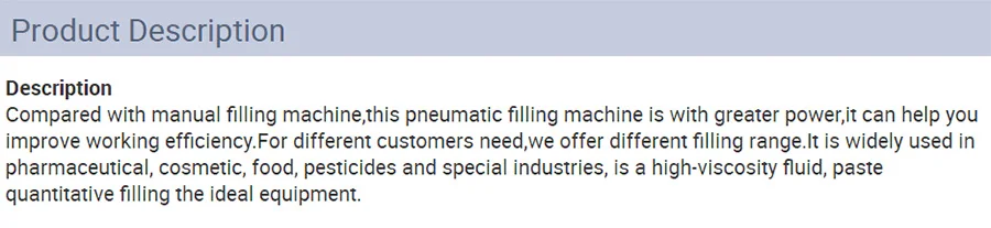 Структура этой машины для наполнения пасты является простой и разумной точностью, простой в эксплуатации, удобный дизайн в большей степени соответствует требованиям современного предприятия. Широко используется в фармацевтической, косметической, пищевой, пестицидной и специальной промышленности, является высокой вязкостью жидкости, пасты количественного наполнения идеальное оборудование.