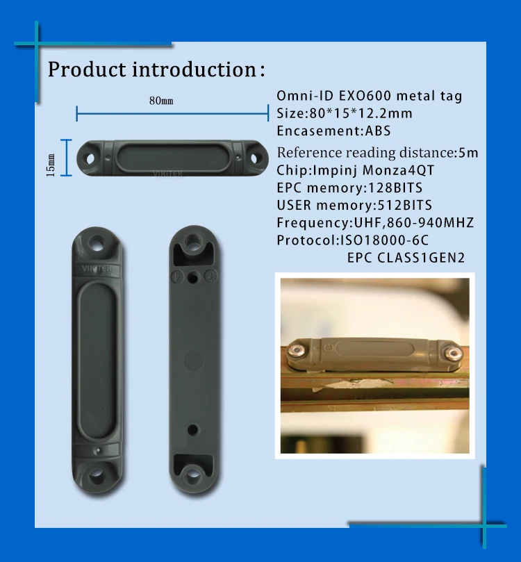 5 шт. Omni-ID EXO600 UHF RFID Анти-металлическая метка ABS 6c пассивная метка 915 МГц Протокол: EPC класс 1 Gen2, ISO18000-6C Частота: УВЧ, 860-940 МГц Размер: 80*15*12,2 мм Материал: АБС-пластик Чип: Impinj Monza4QT Память EPC: 128 бит Память пользователя: 512 бит Вес: 12,5 г Рабочая температура: от-40 ℃ до + 85 ℃ IP Рейтинг: IP68 Приблизительное расстояние считывания: 5 м