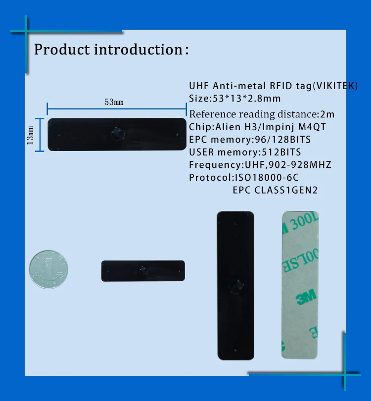 10 шт. UHF RFID Анти-металлическая бирка PCB 6c пассивная бирка 915 МГц Протокол: EPC класс 1 Gen2, ISO18000-6C Частота: UHF, 902-928 МГц Размер: 53*13*2,8 мм Материал: PCB Чип: Alien Higgs3/Impinj Monza4QT Память EPC: 96 бит/128 бит Память пользователя: 512 бит Вес: 3,76 г Рабочая температура: от-30 ℃ до + 85 ℃ IP Рейтинг: IP67 Приблизительное расстояние чтения: 2 м