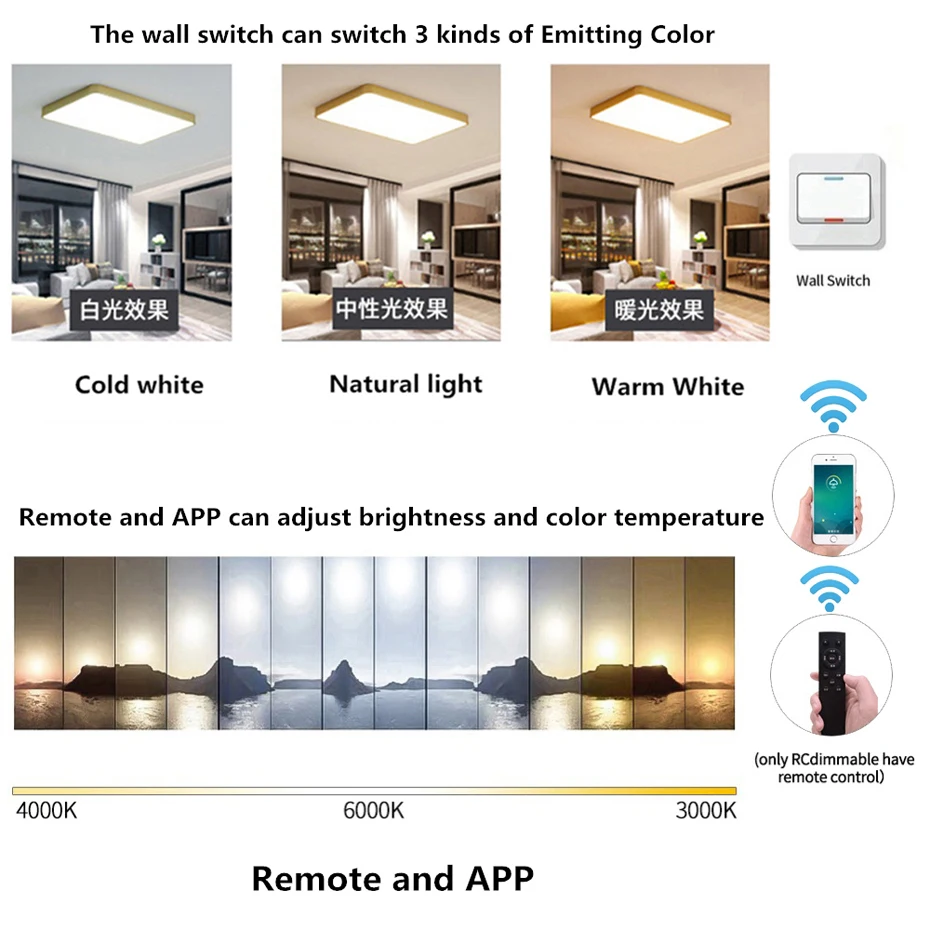 【RC Dimmable】:with Remote Control function. Brightness dimmable, color temperature changeable.