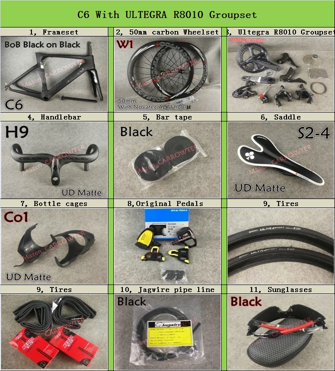 Такие как: 1, комплект рам. 1> Модель: Новинка 1-C8 (Выберите один) 2> Размер: XXS/XS/S/M/L/XL (Выберите один) 3> плетение: UD 4> Отделка: глянцевая/матовая (Выберите один) 5>BB: BB386 2, Углеродные колеса 1> Модель: 50 мм 2> переплетение поверхности: UD/3K (Выберите один) 3> Тип: клинчер 4> Отделка: матовая/глянцевая (Выберите один) 5> передние/задние: 20/24 часа в сутки 6> ширина тормозной дорожки: 23 мм 7> ступицы: Novatec A271 хаб 8> Цвет ступицы: черный 9> Цвет спиц: черный 10> Цвет сосков: черный 11> Быстрый выпуск Цвет: черный 12>Casste body: $ himan0 11s 3, Groupset --- какой из них вам нужен? 1> Тип: R8010 2> кассеты: 11-28T 3> Размер кривошипа: 170/172.5 мм (Выберите один) 4> коленчатый набор: 50-34T/53-39T (Выберите один) 4, углеродный руль для шоссейного велосипеда 1> Модель: H1-2--H9 (Выберите один) 2> переплетение: UD/3K (Выберите один) 3> Отделка: глянцевая/матовая (Выберите один) 4> Ширина: 400/420/440 мм (по выбору) 5> Длина: 90/100/110/120 мм (по выбору) 5, повязка на руль 1> Цвет: черный 6, седло дорожного велосипеда 1> Модель: S1-1--S4 (Выберите один) 2> переплетение: UD/3K (Выберите один) 3> Отделка: глянцевая/матовая (Выберите один) 7, 1 пара бутылок для воды 1> Модель: Co1 -- Co10 (Выберите один) 2> переплетение: UD/3K (Выберите один) 3> Отделка: глянцевая/матовая (Выберите один) 8, PD-R540 педали 9, шины (какой цвет?) 1> Цвет: черный/красный/синий (Выберите один) 10, Jagwire линия трубы 1> Цвет: черный 11, солнцезащитные очки 1> Цвет: черный