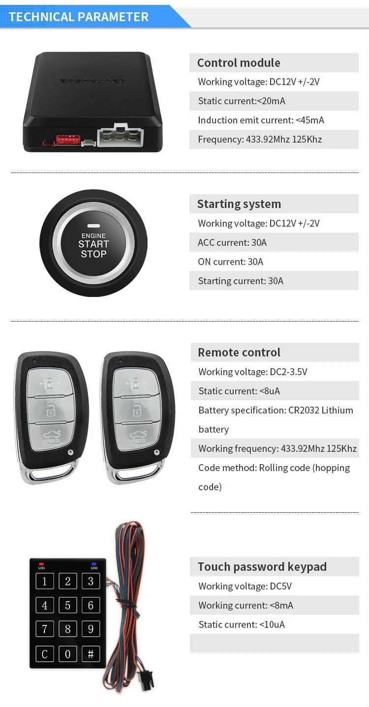 This is ec002-hy2-ns PKE alarm from EASYGUARD with push engine start, remote engine start & shock sensor warning function.
