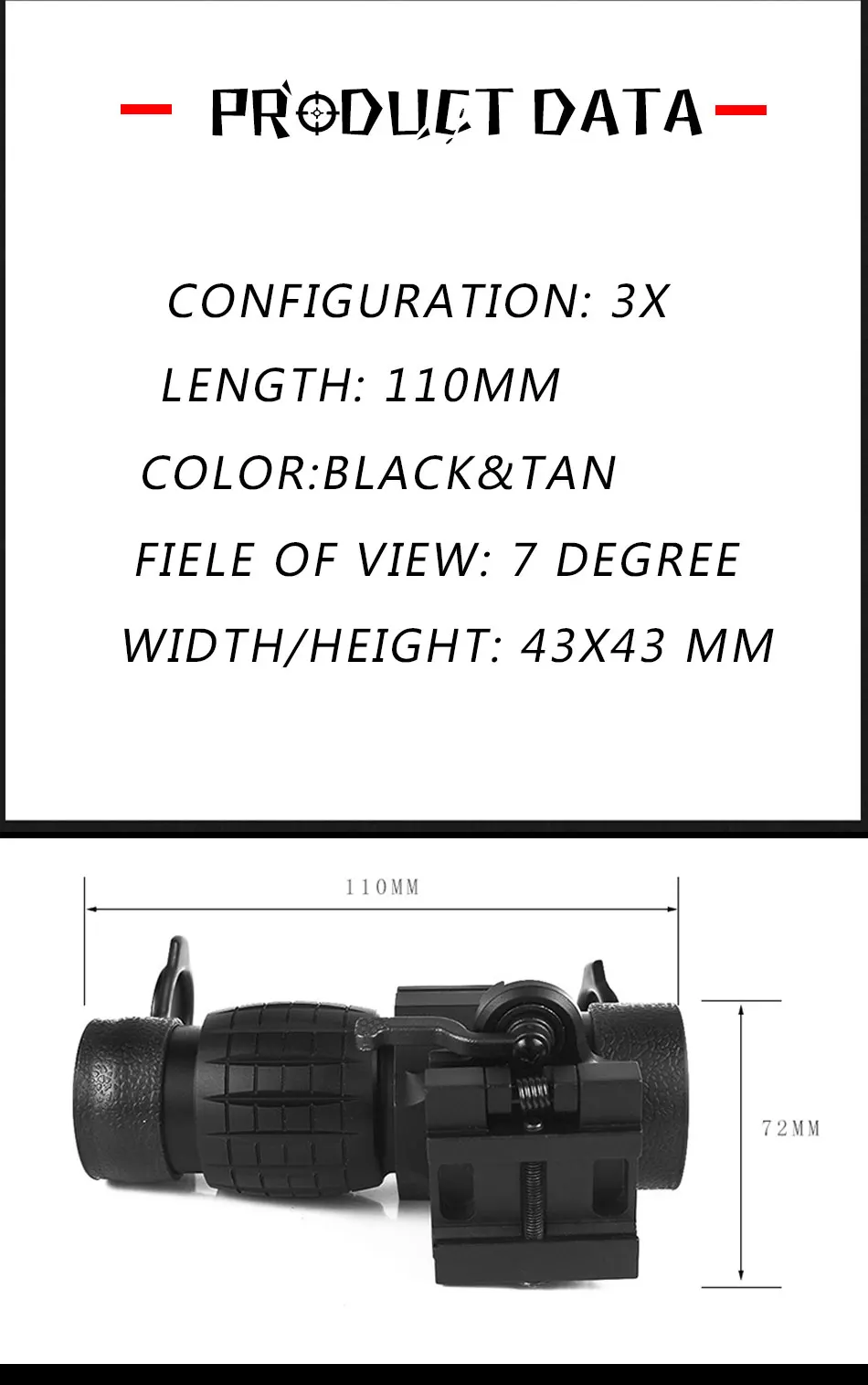 Увеличение: 3X Рельеф глаз: при 5 ° FOV 40 90 мм при полном FOV 60 65 мм Поле зрения (@ 100yds) : 7 Отделка поверхности: анодированный алюминий, темно-серый, покрытый резиной черный Крепление: 3xmag снабжена 30 мм Диаметр Цель трубки. Длина: 110 мм (4,3 дюйма) Ширина/высота: 43x43 мм Монтируется на рельсовой системе за всеми прицелами. Обеспечивает расширенный диапазон для оператора. Линзы с многослойным покрытием (синий). Диоптрий нельзя регулировать. Крепление FTS отличается прочностью и плотно прилегает, не шевелится. Подходит для Weaver/Picatinny Rail. Защита от атмосферных воздействий и ударопрочность