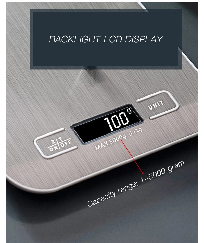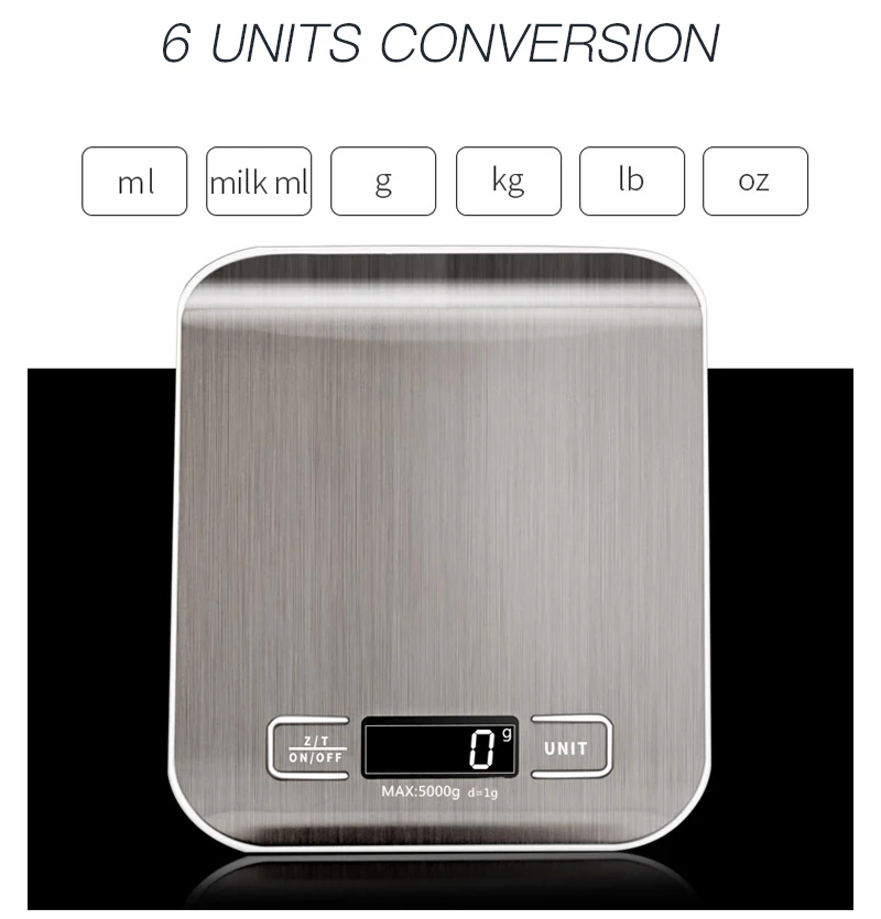 Вы можете легко выбрать один из измерений в oz, lb:oz, g, ml (молоко и вода). Эта цифровая шкала измеряет точный прирост 0,04 унций (1 г), чтобы точно взвешивать ваши товары