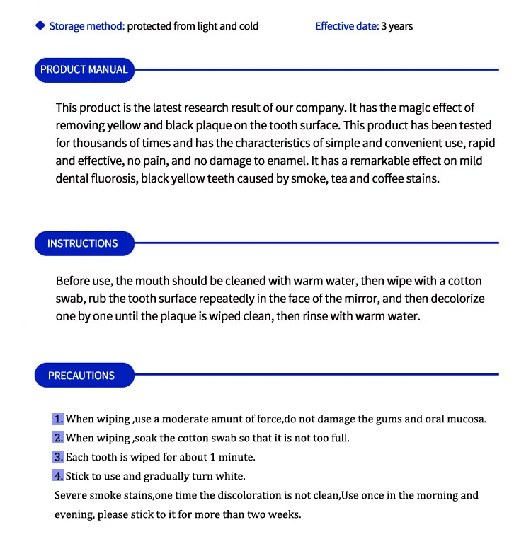 Перед использованием, рот следует очистить теплой водой, затем протереть ватной палочкой, протереть поверхность зуба повторно в лице зеркала, А затем обесцвечивайте один за другим, пока зубной налет не протрется, затем промойте теплой водой.