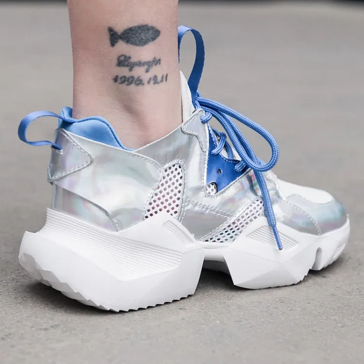 2019 г.; модные кожаные кроссовки цвета металлик, Серебристый; белые туфли на платформе, визуально увеличивающие рост; обувь для папы; популярная женская обувь