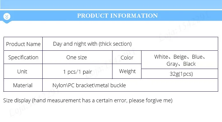 PRODUCT INFORMATION 【Product name:】Day and night with (thick section) 【Specification:】One size 【Unit :】1 pcs/1 pair 【Color:】White、Beige、Blue、Gray、Black 【Weight:】32g(1pcs) 【Material:】Nylon PC bracket, metal buckle Size display (hand measurement has a certain error, please forgive me) The goods is only 1pcs. If you want 1 pair, please buy 2pcs. This product is suitable for the left foot or the right foot, and only one size. For products less than $5, please choose "AliExpress Saver Shipping", thank you for your cooperation! happy!