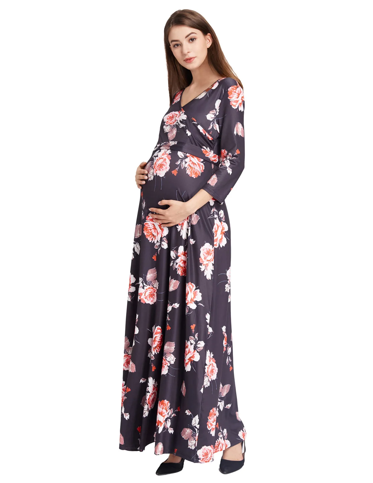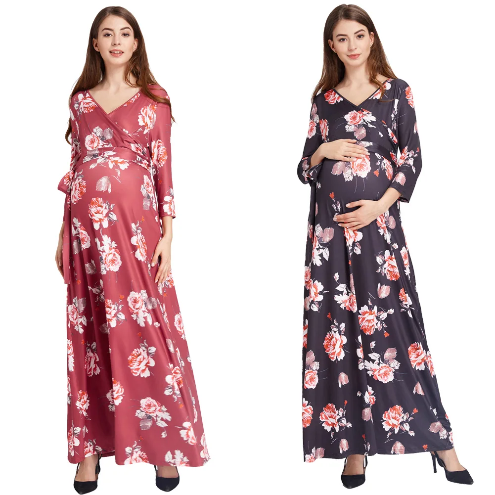 Особенности платья | 1) рукава длиной три четверти 2) треугольный вырез 3) специально разработан для беременных женщин 4) яркий цветочный узор 5) Съемный ремень 6) Силуэт А-силуэта 7) без молнии, без подкладки |