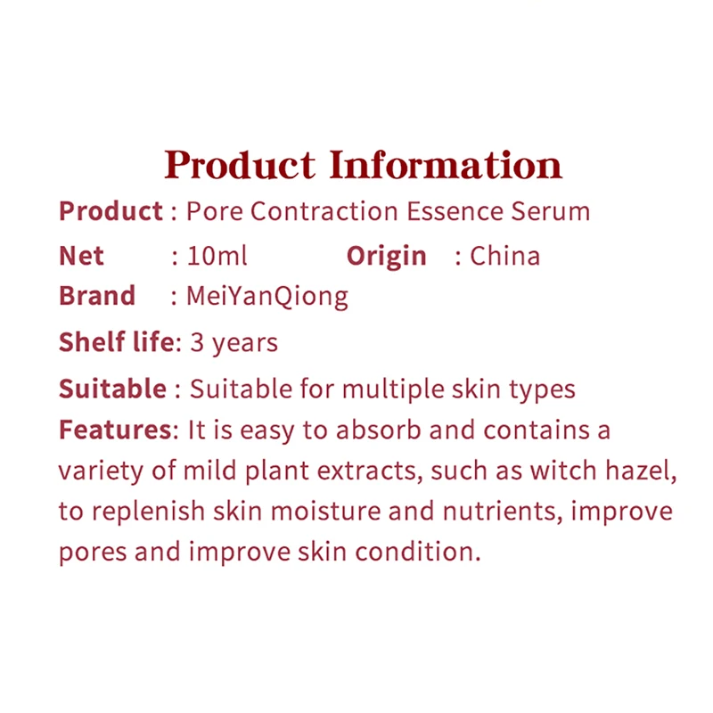 Details: Name: Meiyanqiong face serum Net weight: 10ML Origin : China Brand : Meiyanqiong Shelf life : 3 yearsSuitable : Suitable for multiple skin types Features : It is easy to absorb and contains avariety of mild plant extracts , such as witch hazelto replenish skin moisture and nutrients , improvepores and improve skin condition Ingredients: , WATER 、HAMAMELIS VIRGINIANA (WITCH HAZEL) WATER 、 PROPYLENEGLYCOL 、 GLYCERIN 、 PEG/PPG/POLYBUTYLENE GLYCOL8/513GLYC ERIN . BETAINESODIUMPCA SORBITOL . SERINE 、 GLYCERINK GLUTAMIC ACID 1 ALANINE LYSINEARGININE 、THREONINE PROLINE sNIAC INAMIDE 、 PANTHENOL TRIETHANOL AMINE , CARBOMER oAC RYL ATES/C 10-30 ALKYLACRYLATECROSSPOLYMER 、 SODIUM HYALURONATE 、 PHENOXYETHANOLETHYLHEXYLGLYC ERINS HYDROXYACETOPHENONE 、METHYL PARABEN PROPYLPARABENPEG-40 HYDROGENATED CASTOROIL . SODIUM POLYAC RYLATE y ùDISODIUM EDTA . MENTHYL. L ACTATE . CI 19140