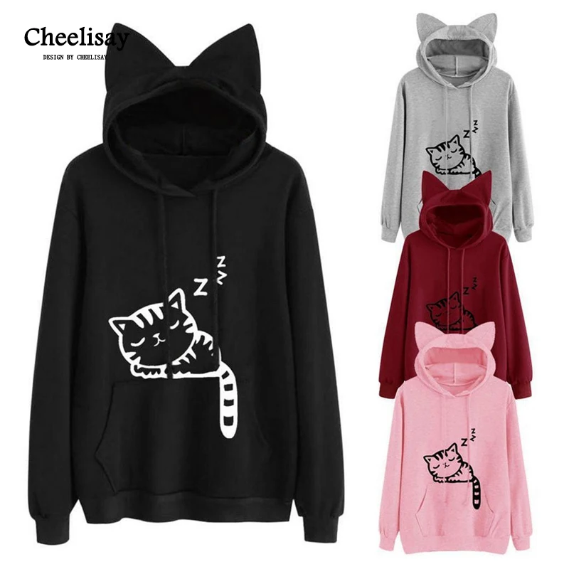 Женские розовые худи с кошачьими ушами, милый свитер с капюшоном и рисунком спящего кота, Свободный пуловер, верхняя одежда, 2019