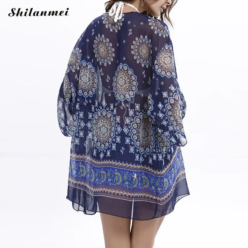 Шифоновый пляжный длинный кардиган с кисточками, женский купальник с принтом, купальный костюм, парео, Пляжная туника Сексуальная короткая туника