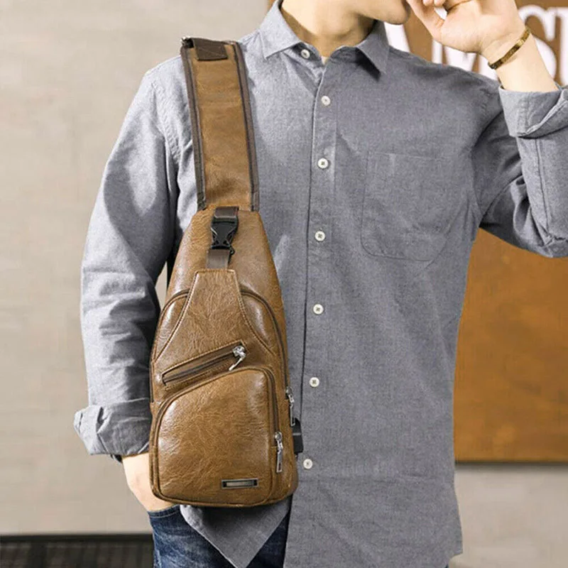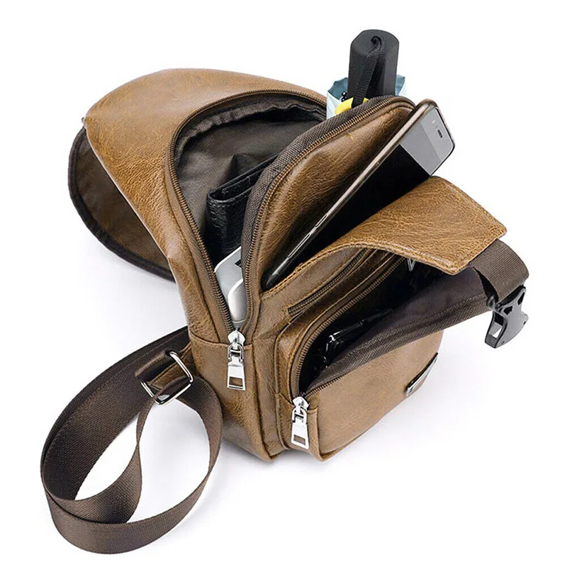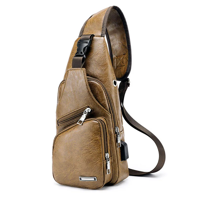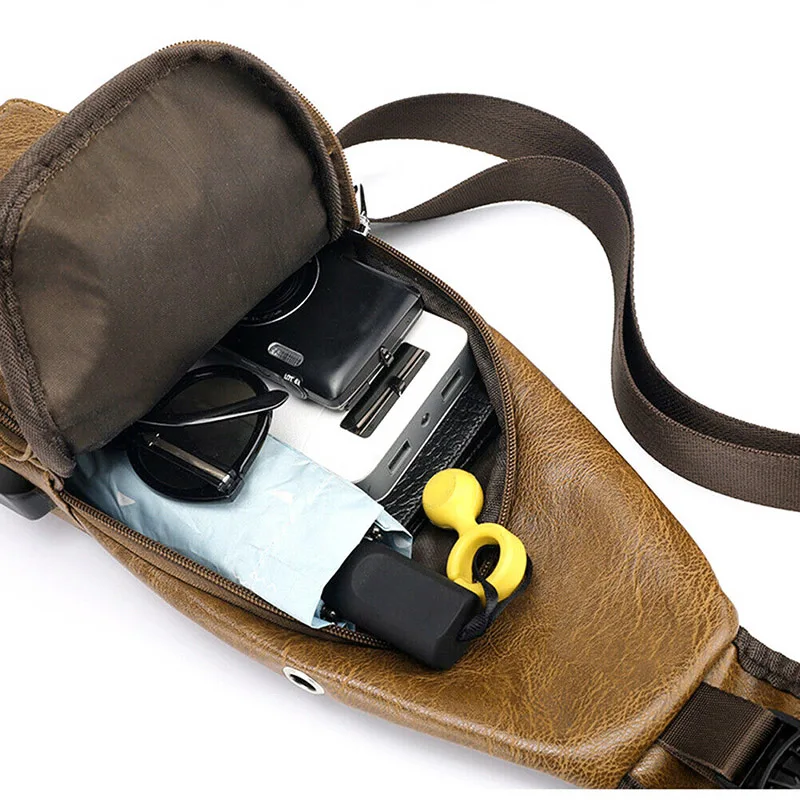 Кожаная нагрудная сумка поставляется с USB-портом для зарядки и отверстием для наушников. Вы можете легко и удобно заряжать телефон, планшет и другие устройства или слушать музыку с MP3-плеером, не открывая рюкзак.