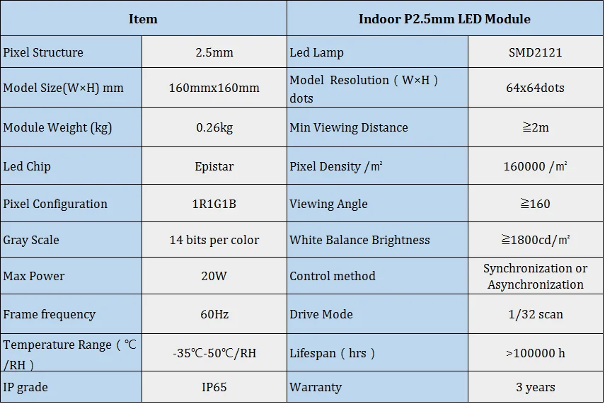 ▪ 1 шт. p2.5мм внутренний 160x160 мм светодиодный модуль ▪ 1 плоский ленточный кабель для передачи данных ▪ 1 шт. кабель питания (если вы покупаете N шт., мы поставим N/2 шт. кабель питания, потому что 1 шт. кабель питания поддерживает 2 модуля)
