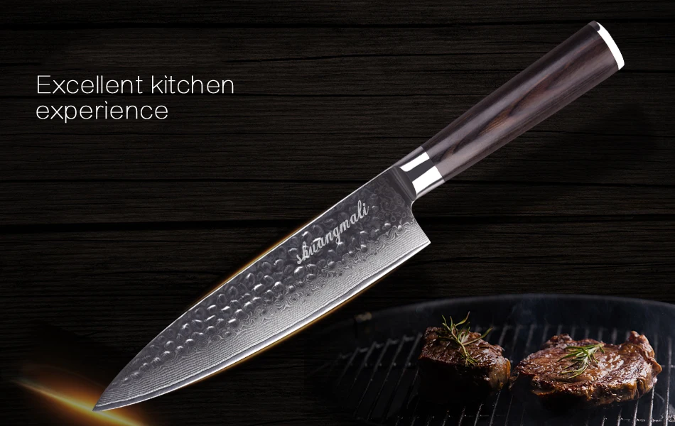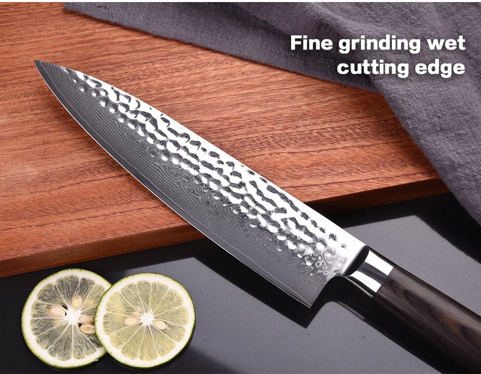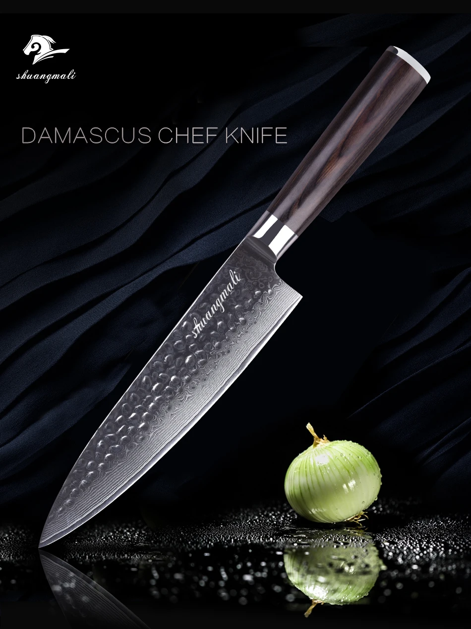 Лезвие: VG-10 Дамасская сталь 67 слой Ручка: палисандр СПЧ: 60 ± 2 Прочность резания: 6,0-8.0N Толщина лезвия: 2,4 мм Вес нетто: 230 г