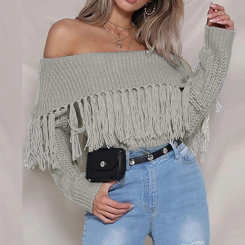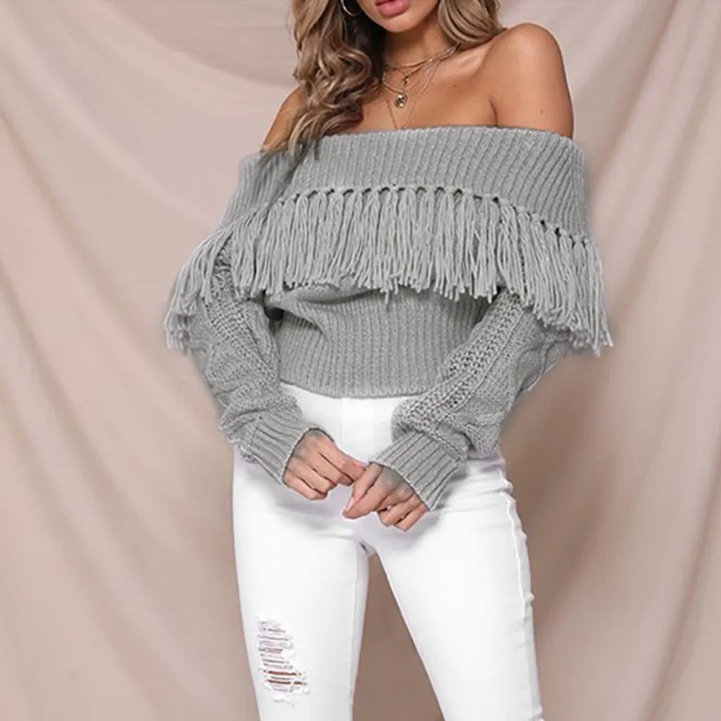 Women Sexy Solid Off Shoulder Tassel Long Sleeve Loose Sweaters Blouse Tops