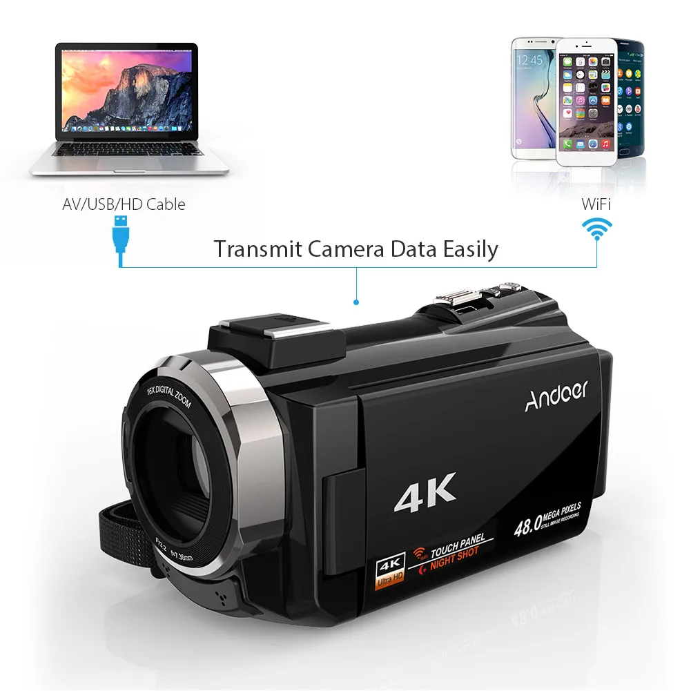 Andoer 4K 1080P 48MP цифровая камера с Wi-Fi для видео Камера видеокамера Регистраторы с 2 шт. Перезаряжаемые Батарейки + 0.39X Широкий формат макро-объектив + внешний микрофон Novatek 96660 чип 3 дюймов емкостный сенсорный экран ИК Инфракрасная камера с режимом ночного прицел 16X цифровой зум