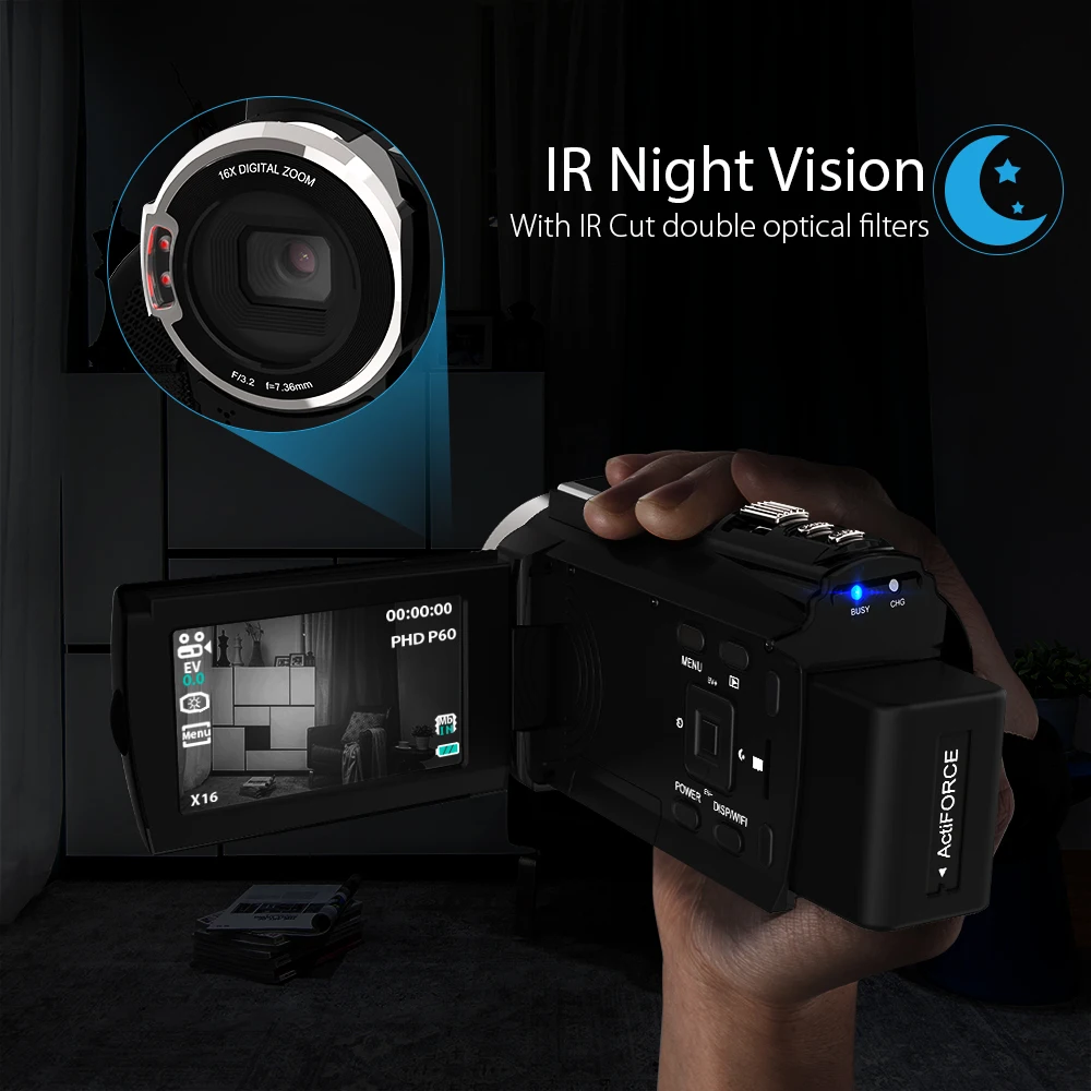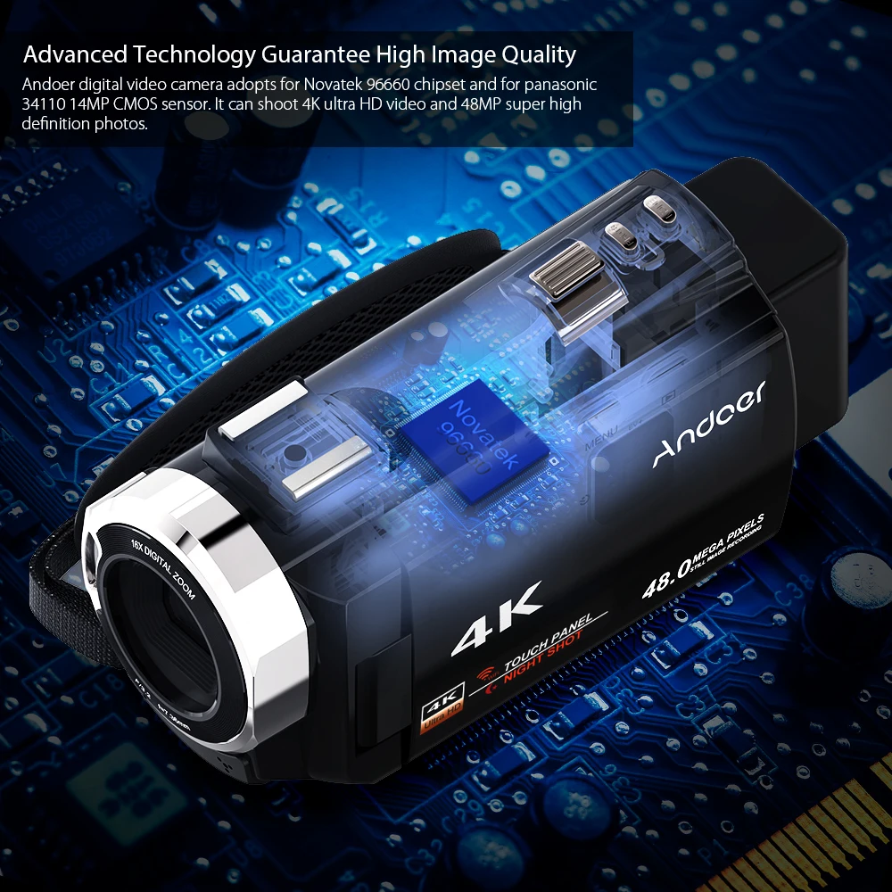Цифровая видеокамера Andoer использует усовершенствованный чип Novatek 96660, он может снимать 4K 24fps (интерполяция) Потрясающие и 48MP (интерполяция) Фото высокой четкости.