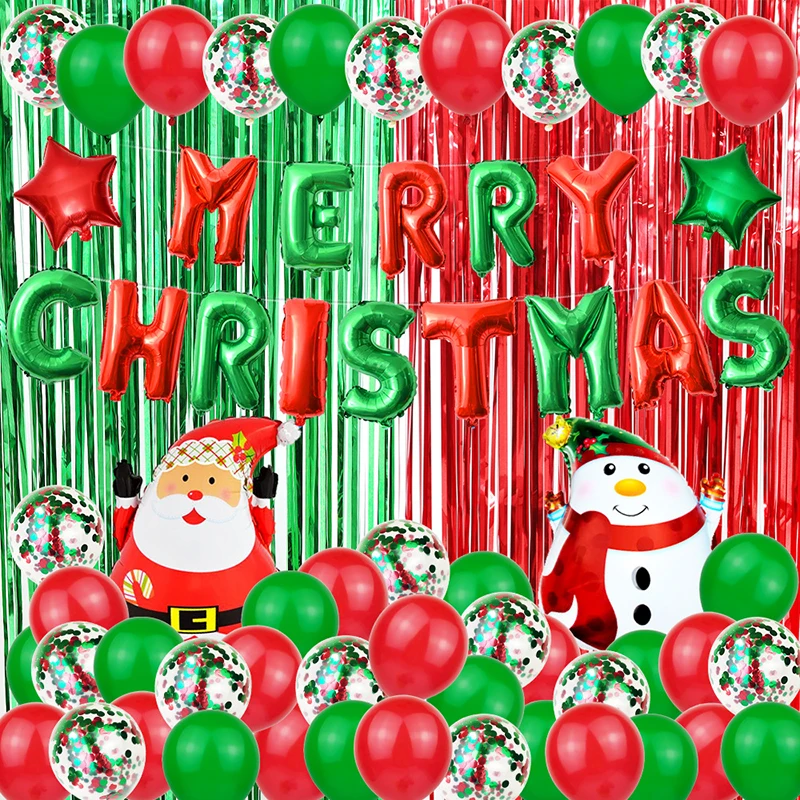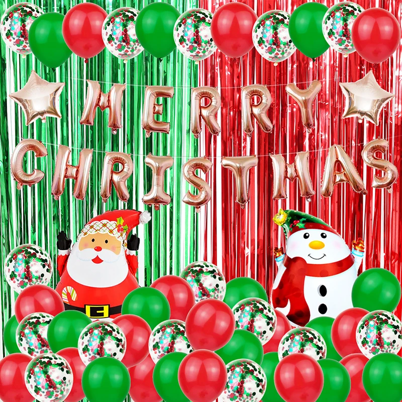 Merry рождественские воздушные шары набор алюминиевой пленки латексный воздушный шар блестки воздушный шар дождь занавес Пятиконечные сатр рождественские украшения игрушки Посылка включает в себя: 1 комплект красного цвета занавески для дождя 2 м * 1 м; 1 комплект зеленый цвет дождевой занавески 2 м * 1 м; 1 комплект с Рождеством; 1 шт. зеленый цвет 10 дюймов пятиконечная звезда; 1 шт. красный цвет 10 дюймов пятиконечная звезда; 15 шт. зеленый цвет 12 дюймов латексные воздушные шары; 15 шт. красного цвета 12 дюймов латексные воздушные шары; 15 шт. 12-дюймовые красные и зеленые пайетки шариков; 1 шт. Санта-Клаус; 1 шт снеговиков;