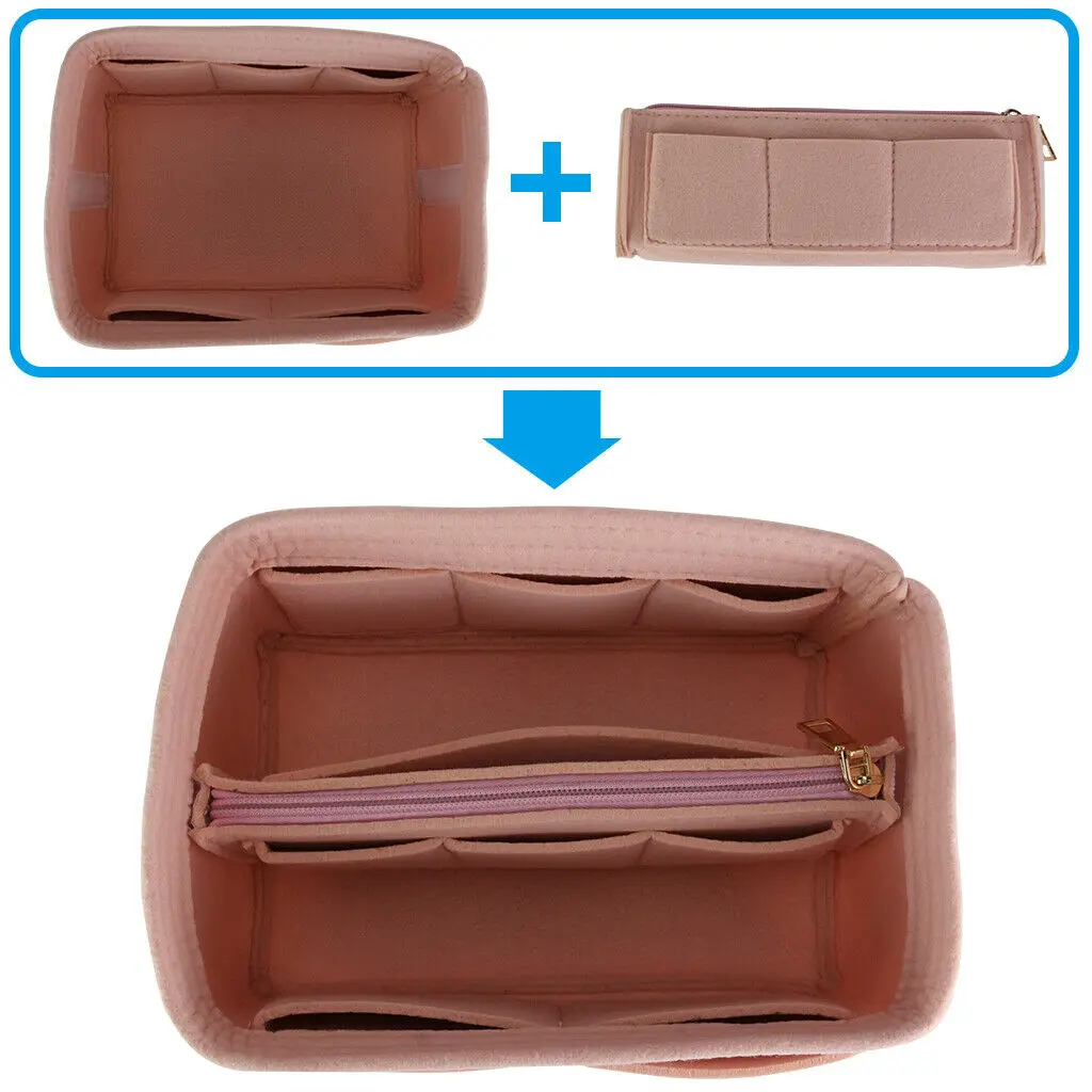 Specifications: Material: Felt Color: Pink, Blacked,Beige Size:(Small L*H*W) Approx. 26*15*14 cm / 10.23*5.9*5.51 inches (Medium L*H*W) Approx. 30*16*16 cm / 11.81*6.3*6.3 inches (Large L*H*W) Approx. 34*18*18 cm / 13.38*7.09*7.09 inches (X Large L*H*W) Approx. 38*20*18cm / 14.96*7.87*7.09 inches Features: 1. Collapsible design, convenient to carry and easy to use. 2. Premium felt, zipper design, sturdy, durable, fashion and smoother. 3. Durable and practical. You can put it into your main bag for extra storage, easy to organize your bag. 4. Large Capacity with multiple pockets,easy to keep storage items such as Cosmetics, Keys Phone, Wallet, Glasses, Notebook and Ipad. 5. Ideal for household, holiday, travelling, overnight stay, etc.