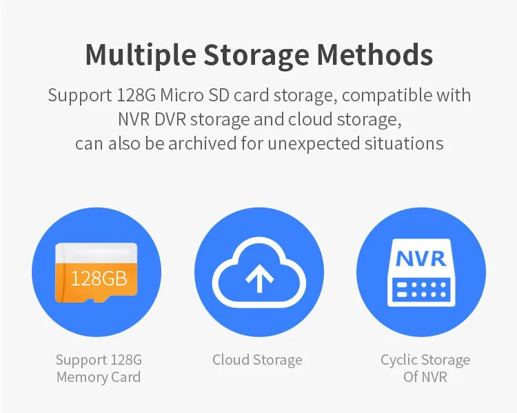 Поддержка Micro SD карты 128G, совместима с NVR DVR хранения и облачного хранения, также может быть записана для неожиданных ситуаций