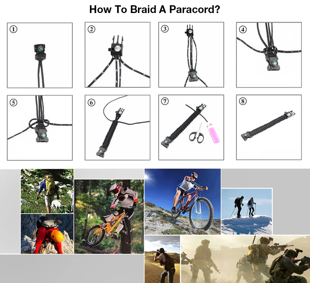 Браслет для выживания из Паракорда -Идеально подходит для кемпинга, охоты, ХикиНГ и другие виды активного отдыха-Инструмент для выживания 7 в 1: компас, свисток, светильник ка, открывалка для бутылок, лезвие из нержавеющей стали, канат из Паракорда, часы-Изготовлен из прочного парашютного шнура, который можно расстегнуть в спасательный трос длиной 3 метра и использовать в экстренной ситуации-Аварийный свисток для сигнала спасателей-С компасом вы не теряете свой путь-Уникальный дизайн и многофункциональность, мода в носке и практичность в использовании-Отличный подарок для ваших друзей или родственников, которые любят Кемпинг и путешествия-Размер: Ширина браслета 2,3 см/0,91 дюйма, длина 23 см/9 дюймовОбратите внимание: что об упаковке у нас есть пластиковый пакет OPP и подарок из нержавеющей сталиУпаковочная коробка,Если вы хотите сделать другу подарок, мы предлагаем вам выбрать упаковку в коробку, если вы просто хотите использовать сами, вы можете выбратьПластиковая упаковка из полипропилена, которая будет дешевле.