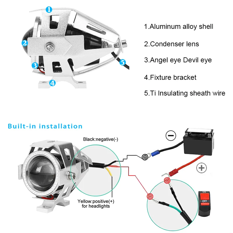 Примечание: Пожалуйста, убедитесь, что эта часть подходит вашему мотоциклу перед покупкой Подходит для Honda, Suzuki, Kawasaki, Yamaha, BMW и KTM грязевых велосипедов и двойного спортивного применения Также применяется для велосипедов, мотоциклов, автомобилей, грузовиков и лодок и т. д. Особенности: Глаза ангела и глаза дьявола, красивый внешний вид, чем обычно. Двойной объектив дает неожиданные световые эффекты, сохраняя безопасность вождения. Корпус из алюминиевого сплава для эффективного рассеивания тепла. Поставляется с балластом высокого качества, что обеспечивает стабильную работу. Низкое энергопотребление и около 200000 часов длительного срока службы. Уникальная непобедимая функция вспышки 3 встроенных режима работы (Дальний свет, ближний свет, мигание). Функция: непрерывный переключатель для изменения режима Высокая мощность CREE-U7 светодиодный, чрезвычайно яркий даже Дневной светильник. Дальний сфокусированный луч позволяет видеть дальний или дальний путь. Технические характеристики: Приспособление: для всех видов транспортных средств (DC12V) Дьявольский глаз (внутренний светодиодный): красный Angel eye (внешнее кольцо): синий/красный/белый/зеленый (Выберите) Материал: алюминиевый сплав Рабочее напряжение: 12 В Люмен: около 3000lm Срок службы: около 200000 часов Высокое качество, простая установка, прочный, очень яркий, водонепроницаемый. Поставляется с кронштейном, винтами. Красный и желтый провод положительный и черный провод отрицательный. Внимание: светильник не имеет прямой видимости, чтобы не влиять на переднюю часть водителя транспортного средства Переключатель Параметры: Материал: АБС-пластик Цвет: черный, красный Количество: 1 шт. 2 проводное соединение 7/8 "(22 мм) Диаметр ручки бар, но можно отрегулировать немного меньше или больше, чтобы соответствовать вашей ручки бар. Посылка включает в себя: 2x CREE светодиодный фара мотоцикла + переключатель