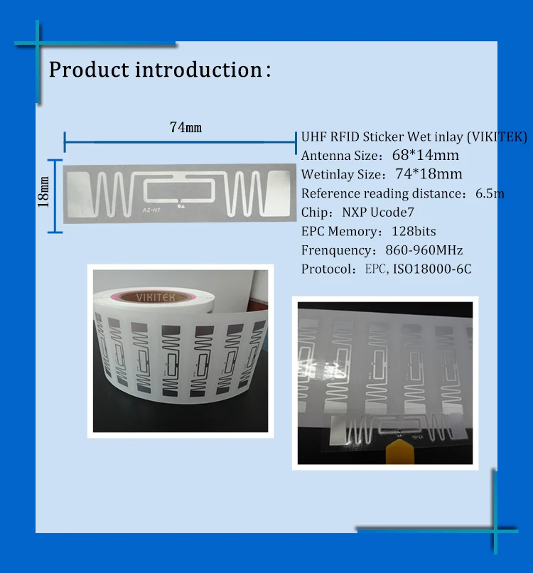 50 шт. AZ-H7 UHF RFID стикер самоклеющийся 6c пассивный тег 915 МГц метка для чипа влажная прокладка Размер влажной подкладки: 74*18 мм Чип: NXP Ucode7 Память EPC: 128 бит Частота: 860-960 МГц Справочном расстояние: 6,5 м Протокол: EPC класс 1 Gen2,ISO18000-6C