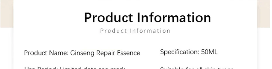 Сыворотка для лица с гиалуроновой кислотой, эссенция женьшеня, с коллагеном, против морщин порМинимизатор Увлажняющий Антивозрастной уход за кожей 50 мл[Эффект продукта]Содержит экстракт женьшеня, текстура нежная и гладкая, роскошный уход за кожей,Восполняет влагу в коже, удерживает влагу без потерь, очищает и увлажняет,Мягкий и деликатный уход, увлажняющая и гладкая кожа.[Ингредиенты]Экстракт корня женьшеня, глицерин, гиалуронат натрия,[Инструкции]Шаг 1: Возьмите одну или две капли оригинальной капельки на ладонь.Шаг 2. Помассируйте щеки всей кожей лица и шеиШаг 3: слегка помассируйте оставшееся количество на нежную кожу вокруг глаз