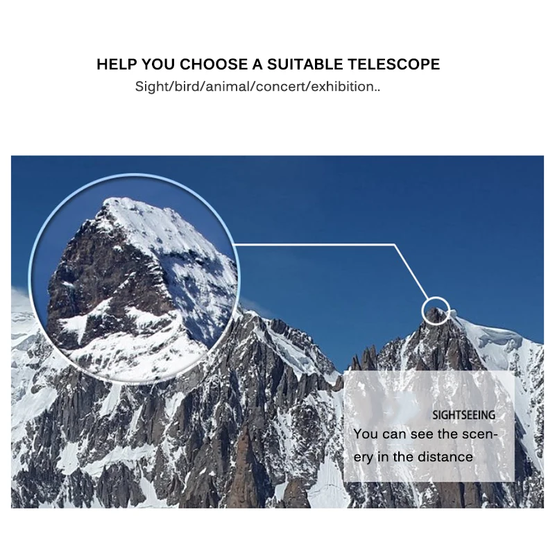 Этот Монокуляр поставляется с поддерживающим штативом и зажимами для телефона для лучшего просмотра. Он может применяться для различных видов деятельности, таких как спортивные соревнования, вокальные концерты, путешествия на открытом воздухе, наблюдение за звездой, охота и т. д.