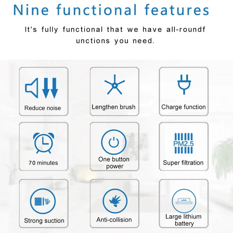 Super Strong Suction.Automatically move and clean the floor.Will Automatically change direction when meet walls and obstacles.Flexible move, with large dust garbage box.Universal driving, sweeping the floor (no need for dust absorbing paper).