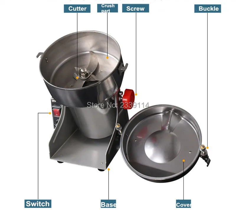Name: Small-size crushing machine Model: XL-04 Rated Voltage: 220V/50Hz Rated Power: 900W Motor Rotation Speed: 25000r/min Capacity: 400g Size: 230*230*250mm Crushing Amount: 400g/min Weight: 6.5kg Product Purpose: Chinese medicinal materials, whole grains, beauty ingredients, food seasoning, fodder, fishing bait,