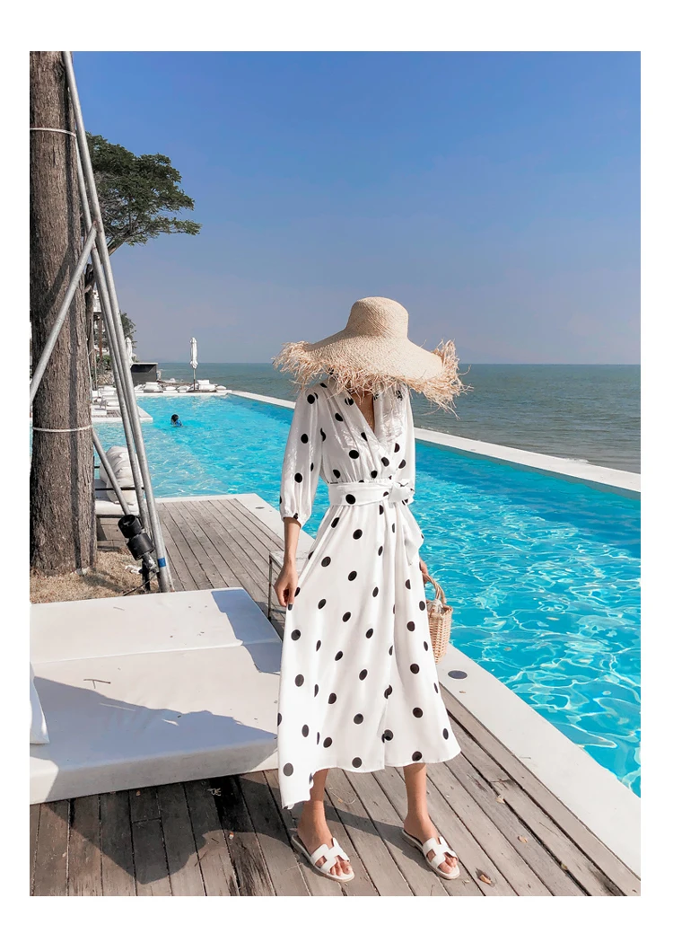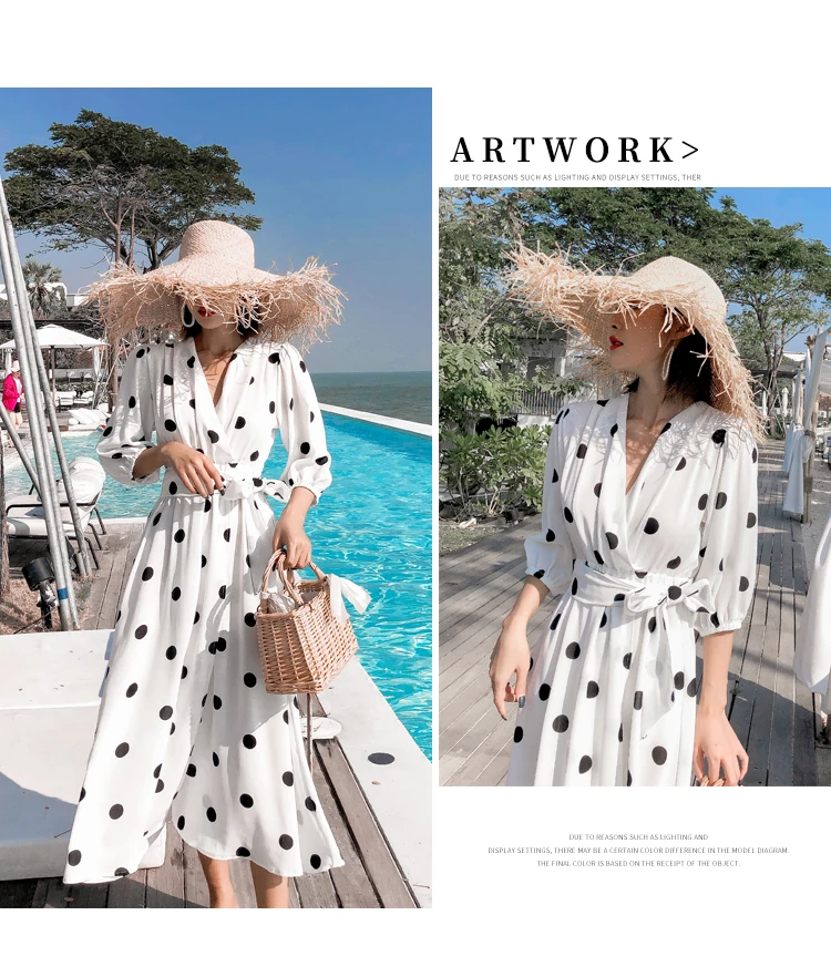 Женское элегантное платье с рукавом-фонариком, новинка, весна-осень, женское платье в черный и белый горошек, длинные платья, S-XL, милые платья, AE572