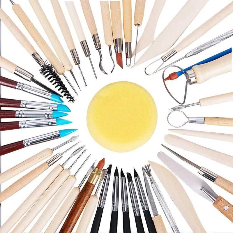 Применение: Глиняные цветные Шейперы: Удалите отпечатки пальцев и пятна с поверхности глины или для формирования цвета, смешивания и рисования. Шариковый стилус: делает точки, гладкие линии в глине или выбивает на мягкий металл или бумагу. Деревянные скульптурные ножи: для моделирования глины, соскабливания, сглаживания, формирования и резки. Инструменты для лепки: для лепки глины, чистки, чистки и многого другого. Губка для керамики: губка для керамики не только для добавления или поглощения воды во время производства, но и для полировки керамики после изготовления.