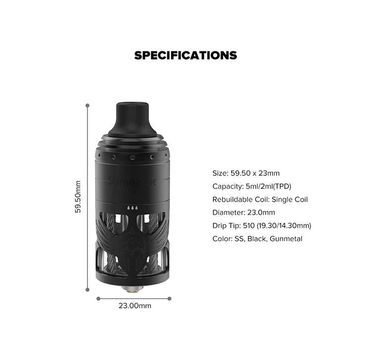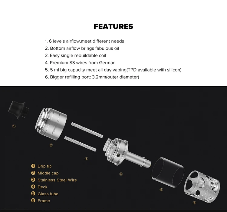 Инструкции: Vapefly брунхильде MTL RTA-это простая Одиночная катушка, которая имеет великолепный внешний вид, разработанный немецкой командой 103. Он не имеет никаких проблем с утечкой и приносит выдающийся вкус. С капельным наконечником из полимерного материала и проводами из высококачественной нержавеющей стали из Германии, это, несомненно, обеспечивает идеальный пар. Оснащен большой емкостью 4,5 мл для парения в течение всего дня. Более того, 6 уровней управления потоком воздуха отвечают вашим различным требованиям: Φ0.9мм; 1.1.2мм; 1.1.4мм; Φ1.8мм; Φ2.1мм; Φ2.5мм. Особенности 1. 6 уровней воздушного потока, удовлетворяют различные потребности 2. Нижний поток воздуха приносит Сказочный вкус 3. Простая одностворчатая катушка 4. Премиум SS провода из Германии 5. Большая емкость 5 мл подходит для парения в течение всего дня (TPD доступен с кремнием) 6. Большой порт заправки: 3,2 мм (внешний диаметр) Технические характеристики Размер: 59,50x23 мм Емкость: 5 мл/2 мл (TPD) Восстановленная катушка: одна катушка Диаметр: 23,0 мм Наконечник: 510 (19,30/14,30 мм) Цвет: SS, черный, металлический Упаковка 1 х брунхильд MTL RTA 1 стеклянная трубка (5 мл) 1 х длинный капельный наконечник (смола) 2 провода из нержавеющей стали 6 x винтовых комплектов воздушного потока 9 х уплотнительных колец 2 x готовые 26GA 1.0Ω (Ni 80) 1 х шестигранный ключ 1 отвертка t-типа 8 винтов 2 х огнеупорный хлопок 1 x Руководство пользователя